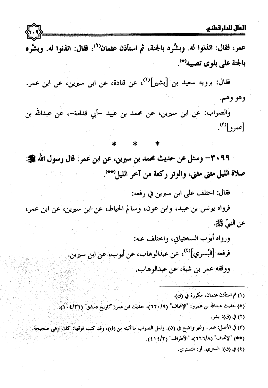 3099- وَسُئِلَ عَنْ حَدِيثِ مُحَمَّدِ بْنِ سِيرِينَ، عَنْ ابْنِ عُمَرَ: قَالَ رَسُولُ اللَّهِ صَلَّى اللَّهُ عَلَيْهِ وسلم صلاة الليل مثنى مثنى، والوتر ركعة من آخر الليل.