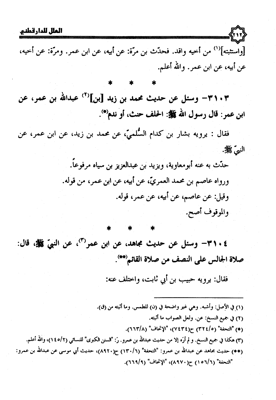 3104- وَسُئِلَ عَنْ حَدِيثِ مُجَاهِدٍ، عَنِ ابْنِ عُمَرَ، عَنِ النَّبِيِّ صَلَّى اللَّهُ عليه وسلم قال: صلاة الجالس على النصف من صلاة القائم.
