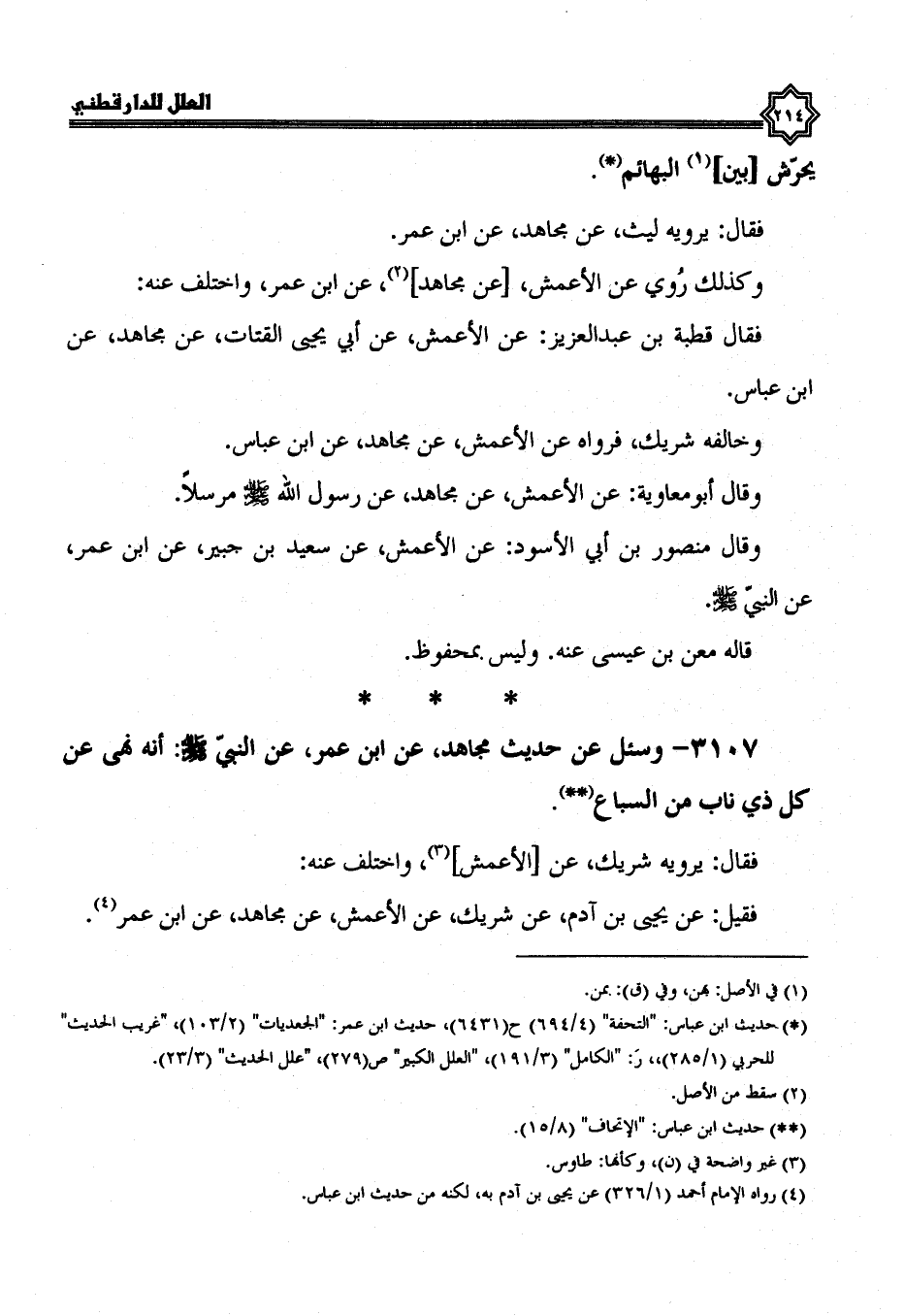 3107- وَسُئِلَ عَنْ حَدِيثِ مُجَاهِدٍ، عَنِ ابْنِ عُمَرَ، عَنِ النَّبِيِّ صَلَّى اللَّهُ عليه وسلم؛ أنه نَهَى عَنْ كُلِّ ذِي نَابٍ مِنَ السِّبَاعِ.