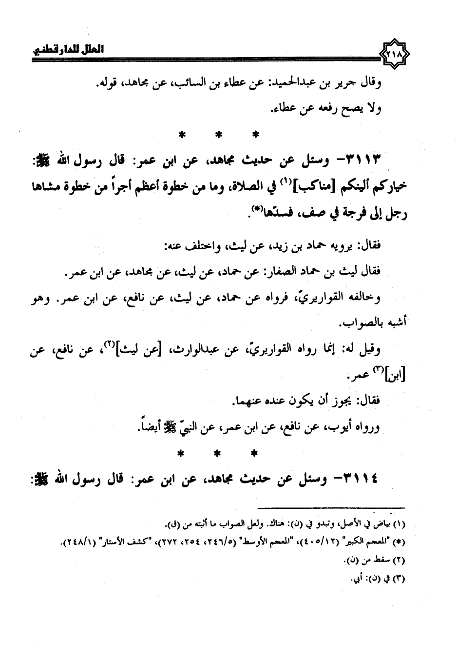 3113- وَسُئِلَ عَنْ حَدِيثِ مُجَاهِدٍ، عَنِ ابْنِ عُمَرَ: قَالَ رَسُولُ اللَّهِ صَلَّى الله عليه وسلم خياركم ألينكم مناكب في الصلاة، وما من خطوة أعظم أجرا من خطوة مشاها رجل إلى فرجة في صف، فسدها.