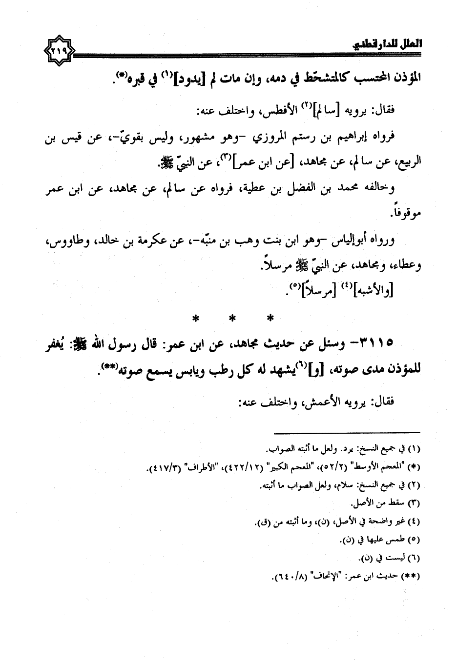 3114- وَسُئِلَ عَنْ حَدِيثِ مُجَاهِدٍ، عَنِ ابْنِ عُمَرَ: قَالَ رَسُولُ اللَّهِ صَلَّى الله عليه وسلم المؤذن المحتسب كالمتشحط في دمه، وإن مات لم يدود في قبره.
