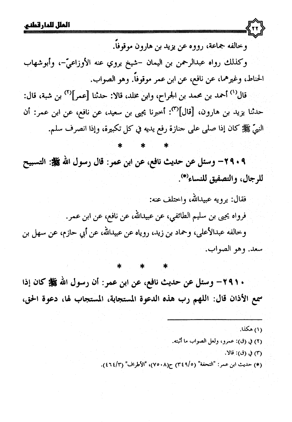 2909- وَسُئِلَ عَنْ حَدِيثِ نَافِعٍ، عَنِ ابْنِ عُمَرَ: قَالَ رَسُولُ اللَّهِ صَلَّى اللَّهُ عَلَيْهِ وَسَلَّمَ: التَّسْبِيحُ لِلرِّجَالِ، وَالتَّصْفِيقُ لِلنِّسَاءِ.