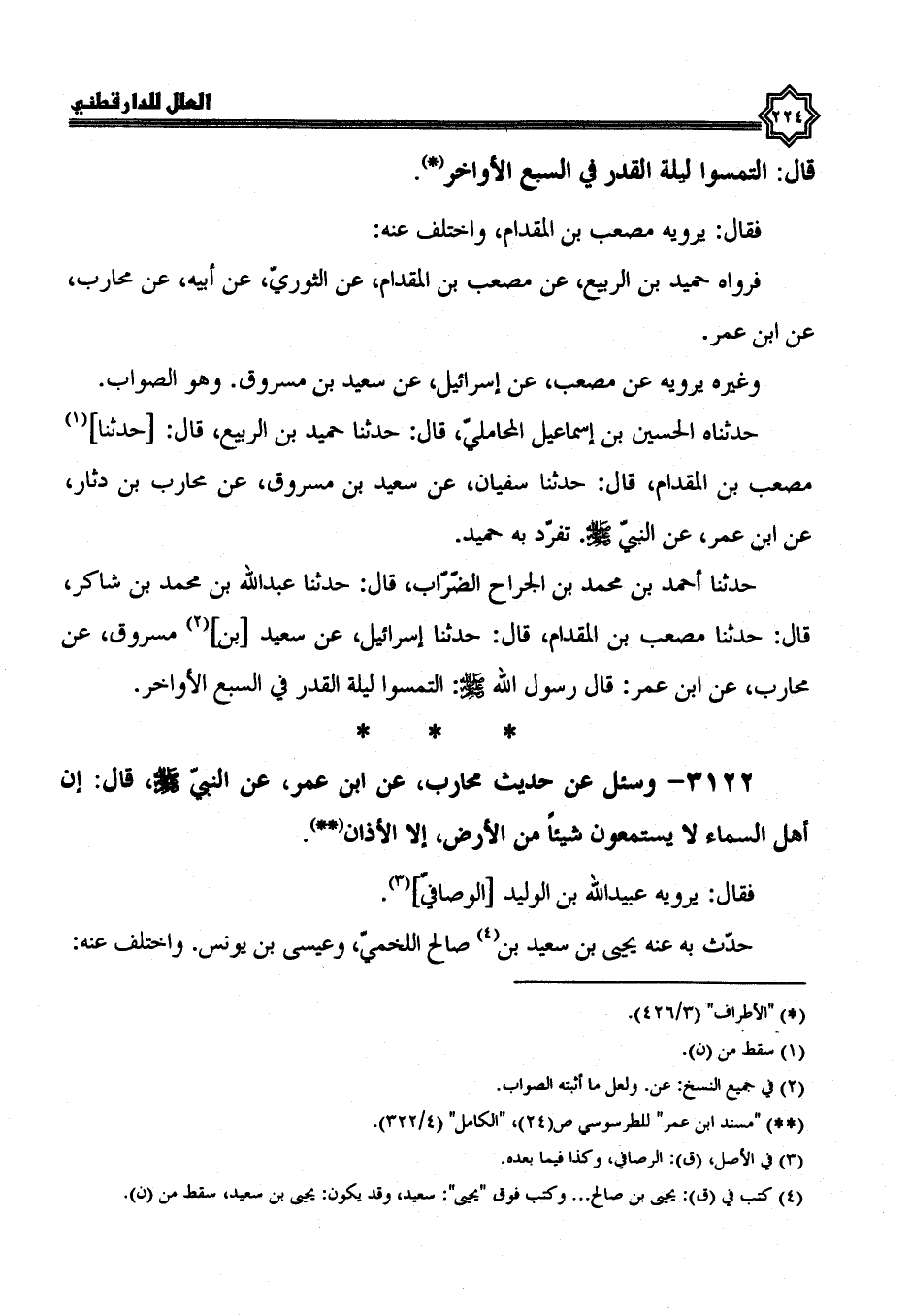 3121- وَسُئِلَ عَنْ حَدِيثِ مُحَارِبِ بْنِ دَثَّارٍ، عَنْ ابْنِ عُمَرَ، عَنِ النَّبِيِّ صَلَّى اللَّهُ عَلَيْهِ وسلم، قال: التمسوا ليلة القدر في السبع الأواخر.