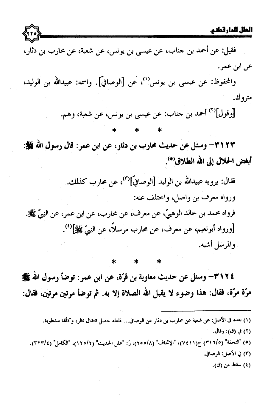 3123- وَسُئِلَ عَنْ حَدِيثِ مُحَارِبِ بْنِ دَثَّارٍ، عَنْ ابْنِ عُمَرَ: قَالَ رَسُولُ اللَّهِ صَلَّى اللَّهُ عَلَيْهِ وسلم أبغض الحلال إلى الله الطلاق.