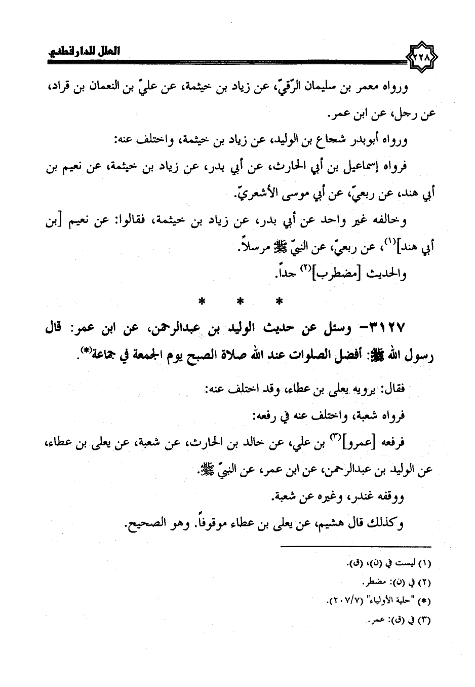 3127- وسئل عن حديث الوليد بن عبد الرحمن، عَنِ ابْنِ عُمَرَ: قَالَ رَسُولُ اللَّهِ صَلَّى اللَّهُ عَلَيْهِ وسلم: أفضل الصلوات عند الله صلاة الصبح يوم الجمعة في جماعة.