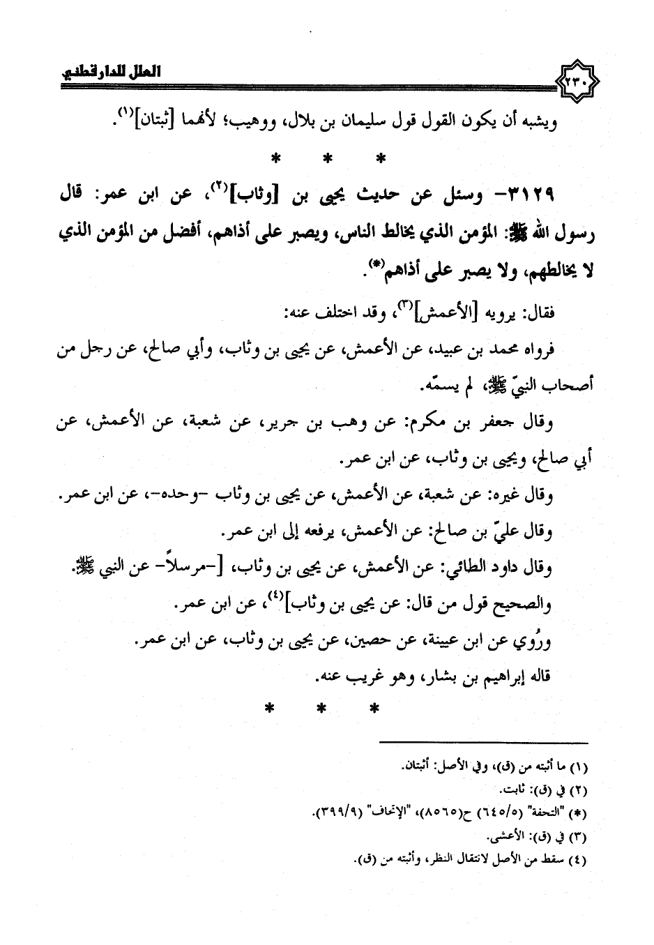 3129- وَسُئِلَ عَنْ حَدِيثِ يَحْيَى بْنِ وَثَّابٍ، عَنِ ابْنِ عُمَرَ؛ قَالَ رَسُولُ اللَّهِ صَلَّى اللَّهُ عَلَيْهِ وسلم: المؤمن الذي يخالط الناس، ويصبر على أذاهم، أفضل من المؤمن الذي لا يخالطهم، ولا يصبر على أذاهم.