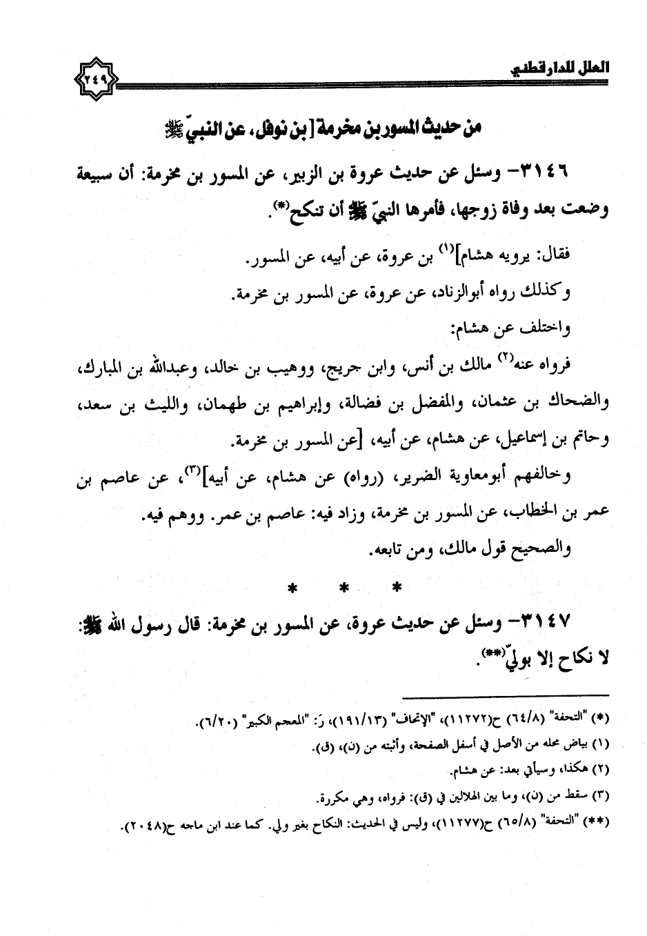 3146- وَسُئِلَ عن حديث عروة بن الزبير، عن المسور بن مخرمة؛ أن سبيعة وضعت بعد وفاة زوجها، فأمرها النبي صلى الله عليه وسلم أن تنكح.