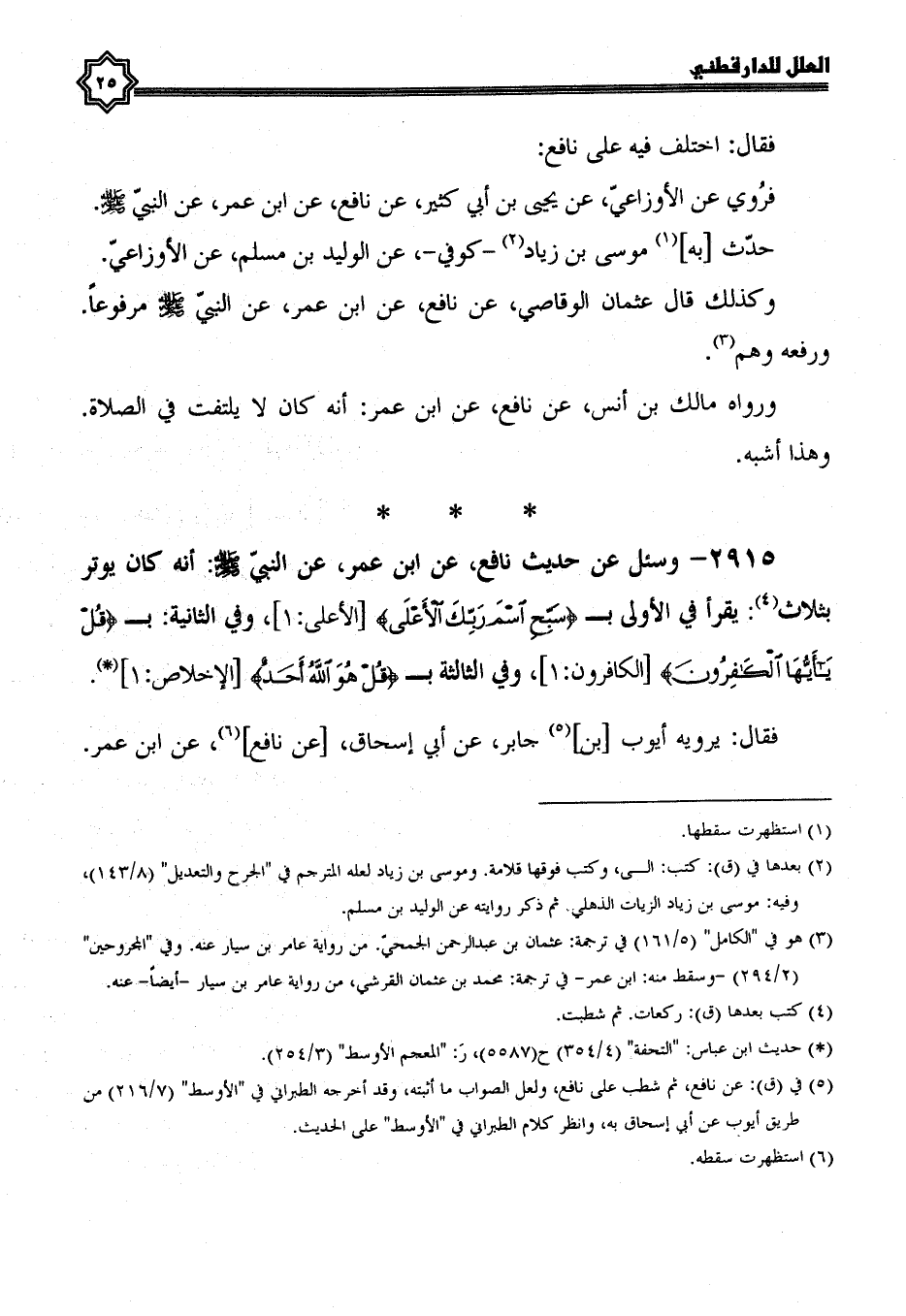 2915- وَسُئِلَ عَنْ حَدِيثِ نَافِعٍ، عَنِ ابْنِ عُمَرَ، عَنِ النَّبِيِّ صَلَّى الله عليه وسلم؛ أنه كان يوتر بثلاث: يقرأ في الأولى بـ {سبح اسم ربك الأعلى} ، وفي الثانية: بـ {قل يا أيها الكافرون} ، وفي الثالثة بـ {قل هو الله أحد} .