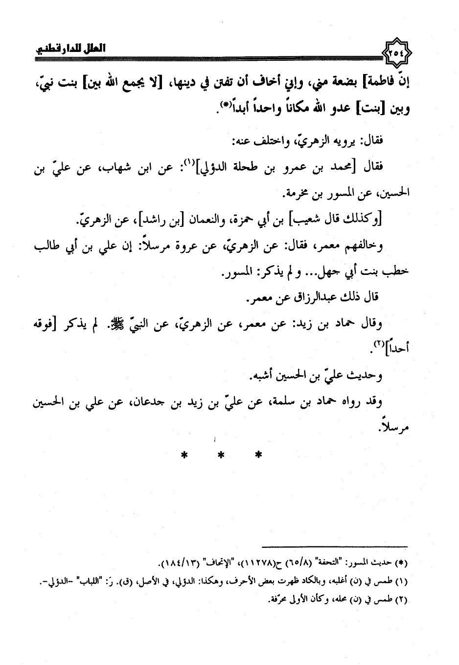 3153- وسئل عن حديث عَلِيِّ بْنِ الْحُسَيْنِ بْنِ عَلِيِّ بْنِ أَبِي طالب، عن المسور بن مخرمة؛ أن عليا خطب بنت أبي جهل، فخطب النبي صلى الله عليه وسلم، وقال: إن فاطمة بضعة مني، وإني أخاف أن تفتن في دينها، لا يجمع الله بين بنت نبي، وبين بنت عدو الله مكانا واحدا أبدا.