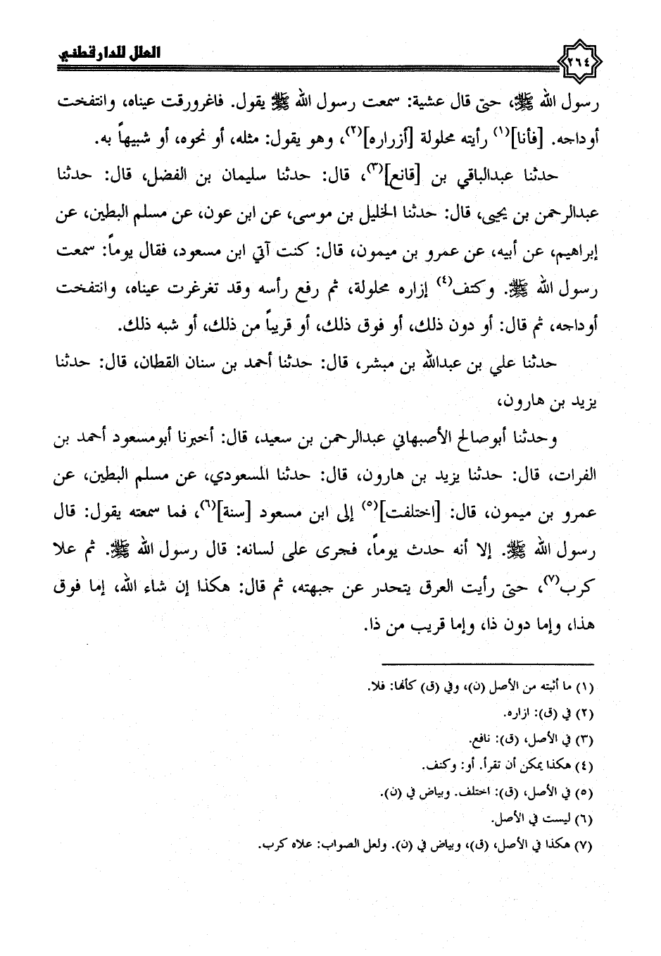 حَدَّثَنَا عَلِيُّ بْنُ عَبْدِ اللَّهِ بْنِ مُبَشِّرٍ، قال: حدثنا أحمد بن سنان القطان، قال: حدثنا يزيد بن هارون، وحدثنا أبو صالح الأصبهاني عبد الرحمن بن سعيد، قال: أخبرنا أبو مسعود أحمد بن الفرات، قال: حدثنا يزيد بن هارون قال: حدثنا المسعودي، عن مسلم البطين، عن عمرو بن ميمون، قال: اختلفت إلى ابن مسعود سنة، فما سمعته يَقُولُ: قَالَ رَسُولُ اللَّهِ صَلَّى اللَّهُ عَلَيْهِ وسلم، إلا أنه حدث يوما، فجرى على لسانه: قال رسول الله صلى الله عليه وسلم، ثم علا كرب، حتى رأيت العرق يتحدر عن جبهته، ثم قال: هكذا إن شاء الله، إما فوق هذا، وإما دون ذا، وإما قريب من ذا.