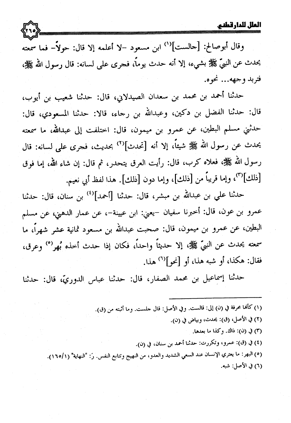 حَدَّثَنَا أَحْمَدُ بْنُ مُحَمَّدِ بْنِ سَعْدَانَ الصَّيْدَلَانِيُّ، قال: حدثنا شعيب بن أيوب، قال: حدثنا الفضل بن دكين، وعبد الله بن رجاء، قالا: حدثنا المسعودي، قال: حدثني مسلم البطين، عن عمرو بن ميمون، قال: اختلفت إلى عبد الله، ما سمعته يُحَدِّثُ عَنْ رَسُولِ اللَّهِ صَلَّى اللَّهُ عَلَيْهِ وسلم شيئا، إلا أنه تحدث بحديث، فجرى على لسانه: قال رسول الله صلى الله عليه وسلم، فعلاه كرب: قال: رأيت العرق يتحدر، ثم قال: إن شاء الله، إما فوق ذلك، وإما قريبا من ذلك، وإما دون ذلك، هذا لفظ أبي نعيم.