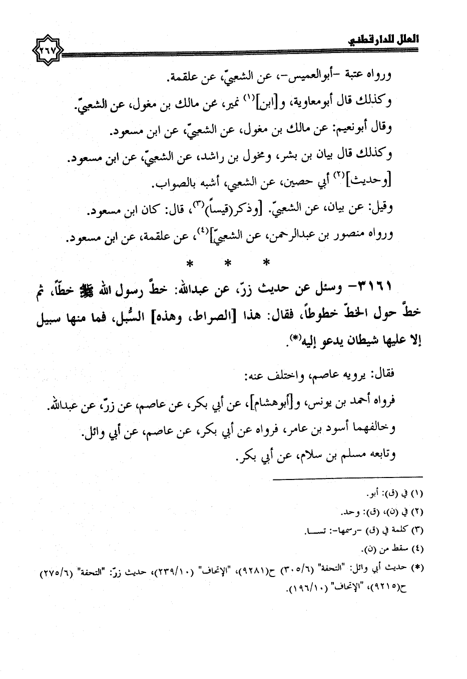 3161- وَسُئِلَ عَنْ حَدِيثِ زِرٍّ، عَنْ عَبْدِ اللَّهِ: خط رسول الله صلى الله عليه وسلم خطا، ثم خط حول الخط خطوطا، فقال: هذا الصراط وهذه السبل، فما منها سبيل إلا عليها شيطان يدعو إليه.