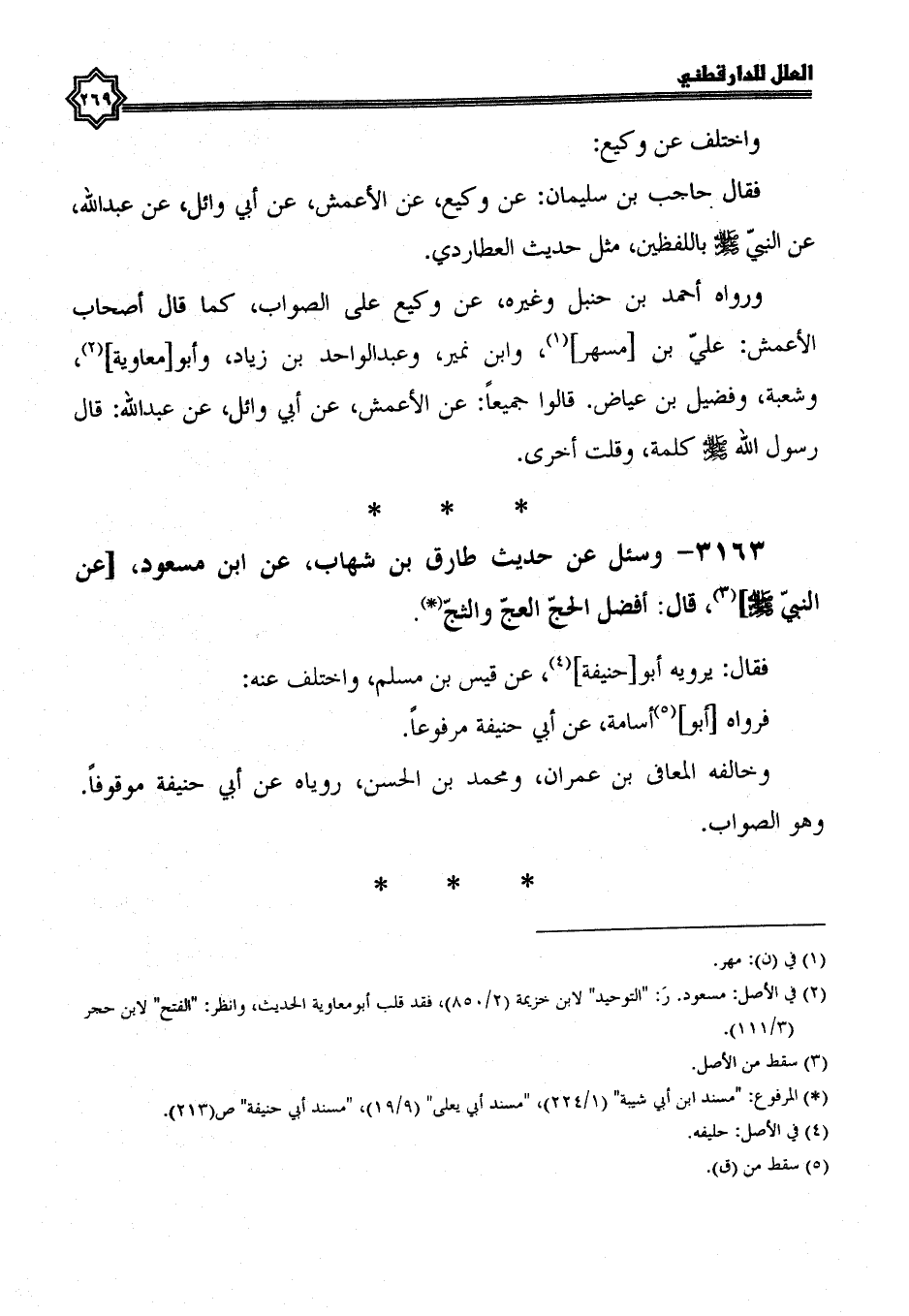 واختلف عن وكيع: فقال حاجب بن سليمان: عن وكيع، عَنِ الْأَعْمَشِ، عَنْ أَبِي وَائِلٍ، عَنْ عَبْدِ اللَّهِ عَنِ النَّبِيِّ صَلَّى اللَّهُ عَلَيْهِ وَسَلَّمَ باللفظين، مثل حديث العطاردي.