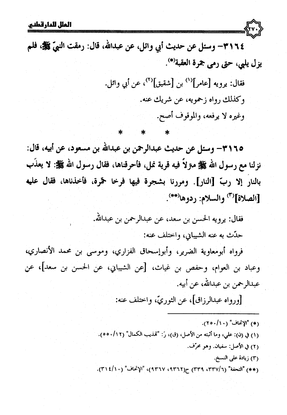 3164- وَسُئِلَ عَنْ حَدِيثِ أَبِي وَائِلٍ، عَنْ عَبْدِ الله، قال: رمقت النبي صلى الله عليه وسلم، فلم يزل يلبي، حتى رمى جمرة العقبة.