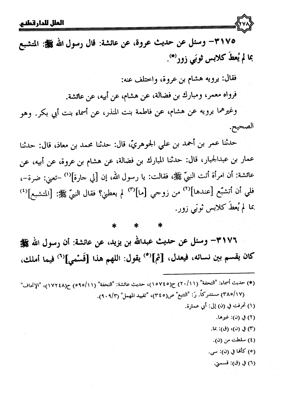 3175- وسئل عن حديث عروة، عن عائشة؛ قال رسول الله صلى الله عليه وسلم: المتشبع بِمَا لَمْ يُعْطَ كَلَابِسِ ثَوْبَيْ زُورٍ.