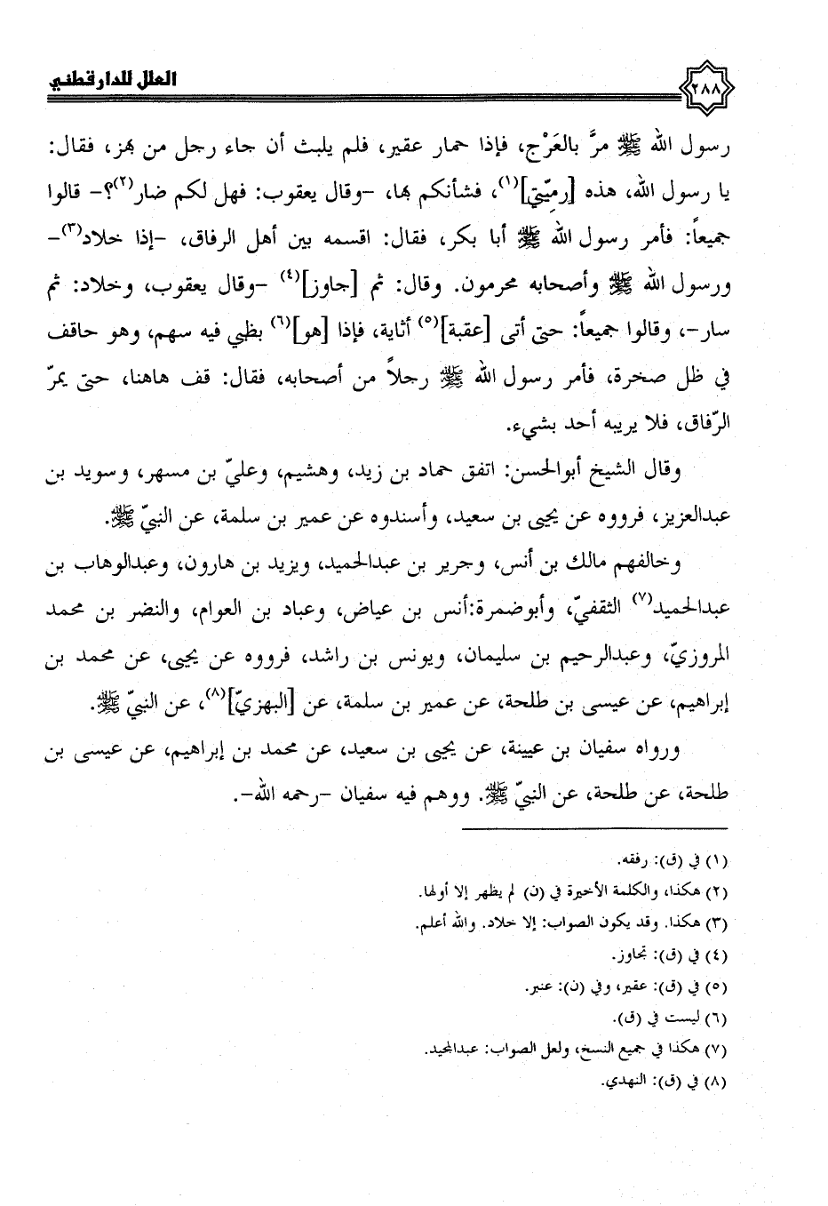 رَسُولُ اللَّهِ صَلَّى اللَّهُ عَلَيْهِ وَسَلَّمَ رجلا من أصحابه فقال: قف هاهنا حتى يمر الرفاق، فلا يريبه أحد بشيء وقال الشيخ أبو الحسن: اتفق حماد بن زيد، وهشيم، وعلي بن مسهر، وسويد بن عبد العزيز، فرووه عن يحيى بن سعيد، وأسندوه عن عُمَيْرِ بْنِ سَلَمَةَ، عَنِ النَّبِيِّ صَلَّى اللَّهُ عَلَيْهِ وَسَلَّمَ وخالفهم مالك بن أنس، وجرير بن عبد الحميد، ويزيد بن هارون، وعبد الوهاب بن عبد الحميد الثقفي، وأبو ضمرة أنس بن عياض، وعباد بن العوام، والنضر بن محمد المروزي، وعبد الرحيم.