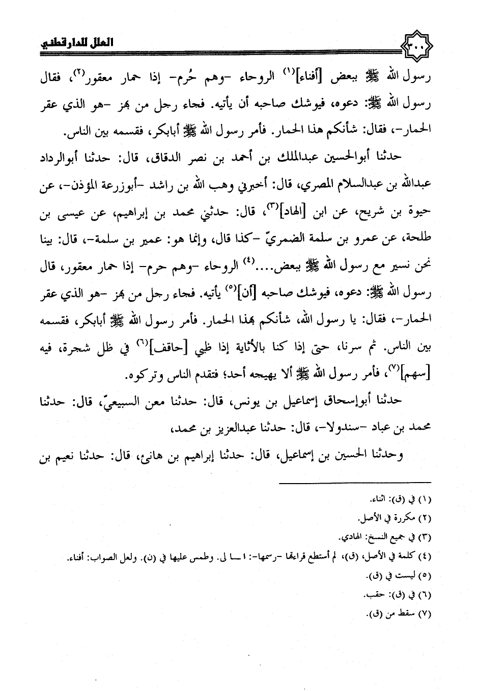 حَدَّثَنَا أَبُو الْحُسَيْنِ عَبْدُ الْمَلِكِ بْنُ أَحْمَدَ بْنِ نَصْرٍ الدَّقَّاقُ، قال: حدثنا أبو الرداد عبد الله بن عبد السلام المصري، قال: أخبرني وهب الله بن راشد أبو زرعة المؤذن، عن حيوة بن شريح، عن ابن الهاد، قال: حدثني مُحَمَّدِ بْنِ إِبْرَاهِيمَ، عَنْ عِيسَى بْنِ طَلْحَةَ، عن عمرو بن سلمة الضمري، كذا قال، وإنما هو عمير بن سلمة، قال: بينا نحن نسير مَعَ رَسُولِ اللَّهِ صَلَّى اللَّهُ عَلَيْهِ وَسَلَّمَ ببعض ... الروحاء، وهم حرم، إذا حمار معقور، قال رسول الله صلى الله عليه وسلم: دعوه فيوشك صاحبه أن يأتيه فجاء رجل من بهز هو الذي عقر الحمار، فقال: يا رسول الله، شأنكم بهذا الحمار فَأَمَرَ رَسُولُ اللَّهِ صَلَّى اللَّهُ عَلَيْهِ وَسَلَّمَ أبا بكر فقسمه بين الناس، ثم سرنا حتى إذا كنا بالأثاية، إذا ظبي حاقف في ظل شجرة فيه سهم، فَأَمَرَ رَسُولُ اللَّهِ صَلَّى اللَّهُ عَلَيْهِ وَسَلَّمَ أَلَا يهيجه أحد، فتقدم الناس، وتركوه.