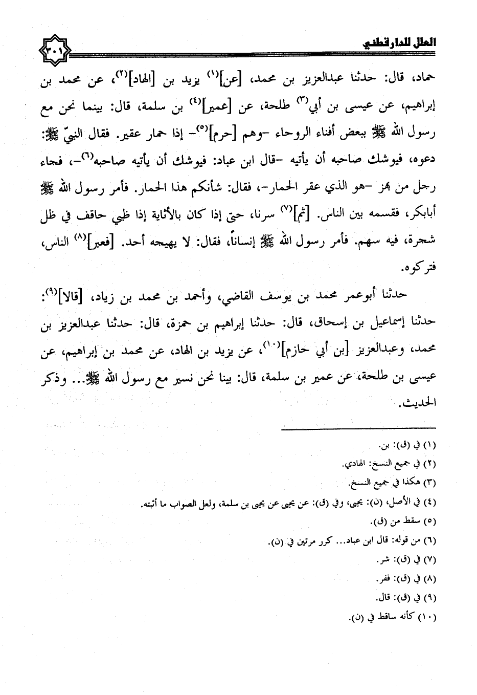 حماد، قال: حدثنا عبد العزيز بن محمد، عن يَزِيدُ بْنُ الْهَادِ، عَنْ مُحَمَّدِ بْنِ إِبْرَاهِيمَ، عن عيسى بن أبي طلحة، عن عمير بن سلمة، قال: بينما نحن مَعَ رَسُولِ اللَّهِ صَلَّى اللَّهُ عَلَيْهِ وَسَلَّمَ ببعض أفناء الروحاء، وهم حرم إذا حمار عقير، فقال النبي صلى الله عليه وسلم: دعوه فيوشك.