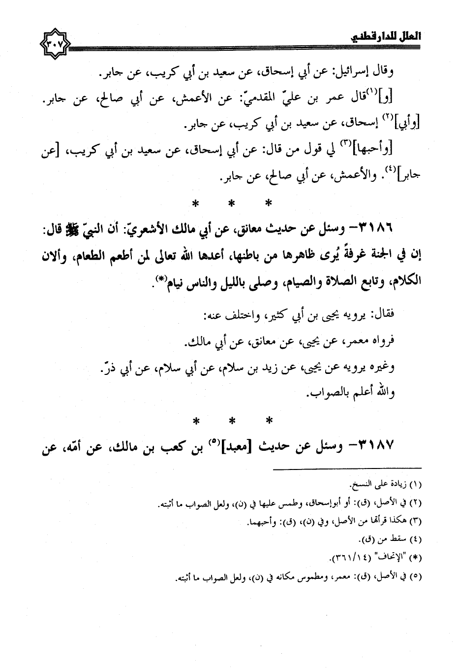 3186- وسئل عن حديث معانق، عن أبي مالك الأشعري، أن النبي صلى الله عليه وسلم، قال: إن في الجنة غرفة يرى ظاهرها من باطنها، أعدها الله تعالى لمن أطعم الطعام وألان الكلام، وتابع الصلاة والصيام، وصلى بالليل والناس نيام.