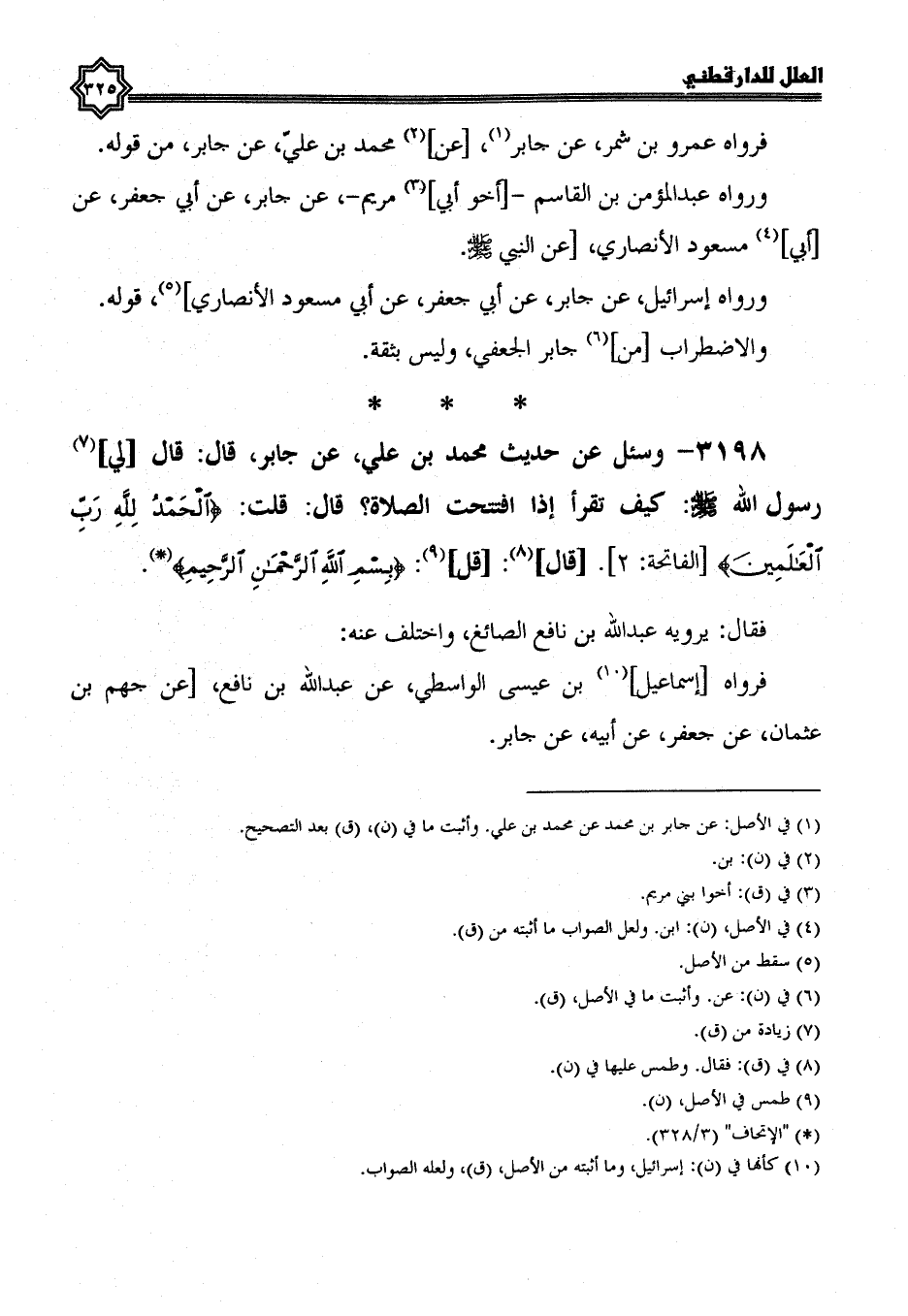 3198- وسئل عن حديث محمد بن علي، عن جابر، قَالَ: قَالَ لِي رَسُولُ اللَّهِ صَلَّى اللَّهُ عَلَيْهِ وسلم: كيف تقرأ إذا افتتحت الصلاة؟ قال: قلت: الحمد لله رب العالمين الفاتحة: 2