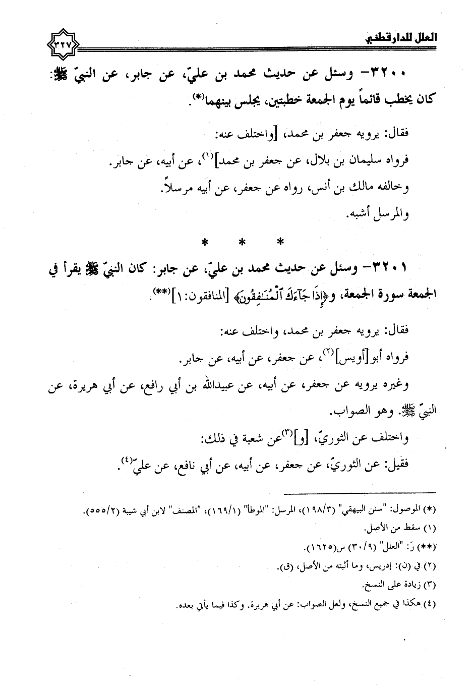 3200- وسئل عن حديث محمد بن علي، عَنْ جَابِرٍ، عَنِ النَّبِيِّ صَلَّى اللَّهُ عَلَيْهِ وَسَلَّمَ: كَانَ يخطب قائما يوم الجمعة خطبتين يجلس بينهما.