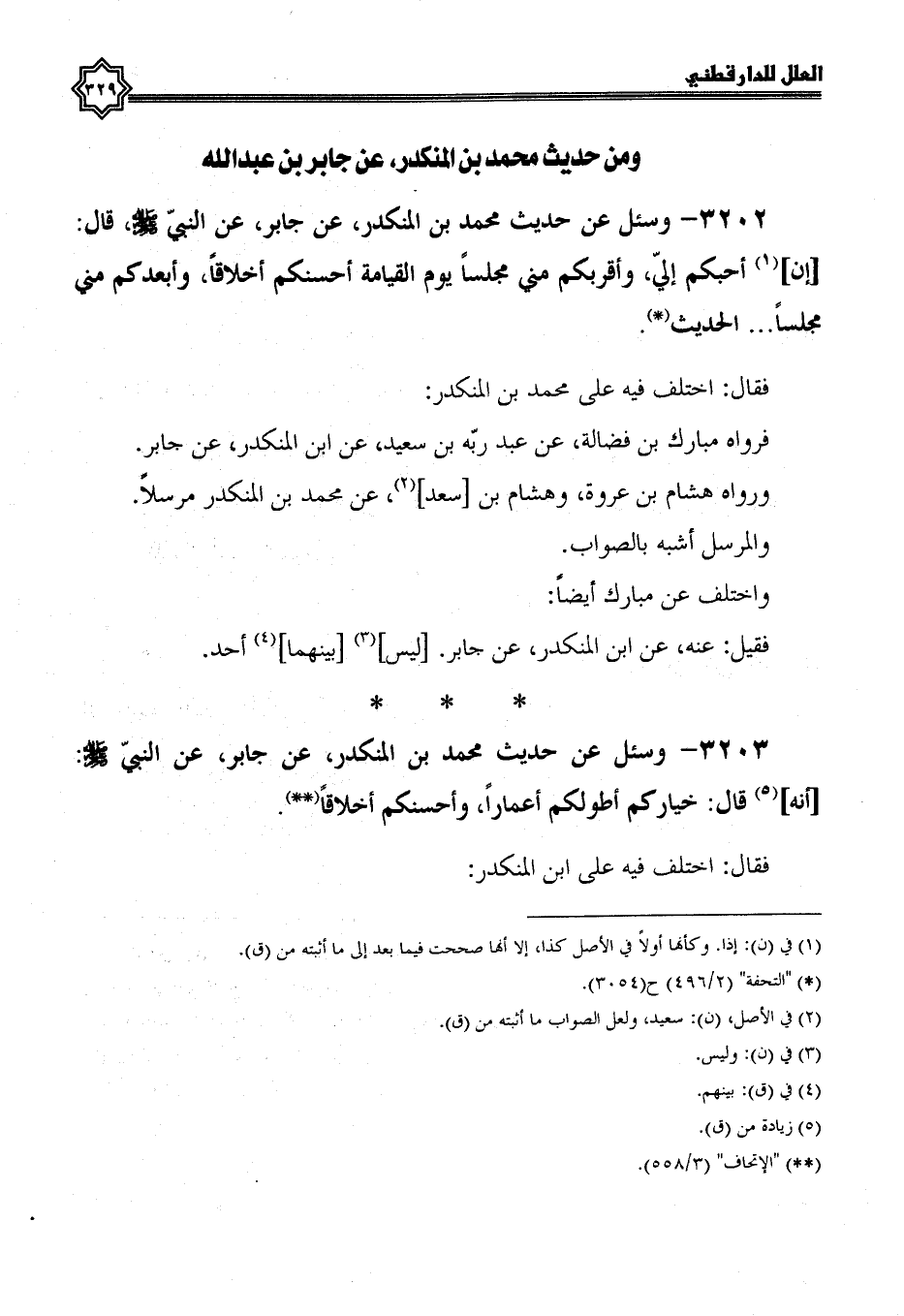 3202- وَسُئِلَ عَنْ حَدِيثِ مُحَمَّدِ بْنِ الْمُنْكَدِرِ، عَنْ جَابِرٍ، عَنِ النَّبِيِّ صَلَّى اللَّهُ عَلَيْهِ وسلم، قال: إن أحبكم إلي، وأقربكم مني مجلسا، يوم القيامة: أحسنكم أخلاقا، وأبعدكم مني مجلسا ... الحديث.