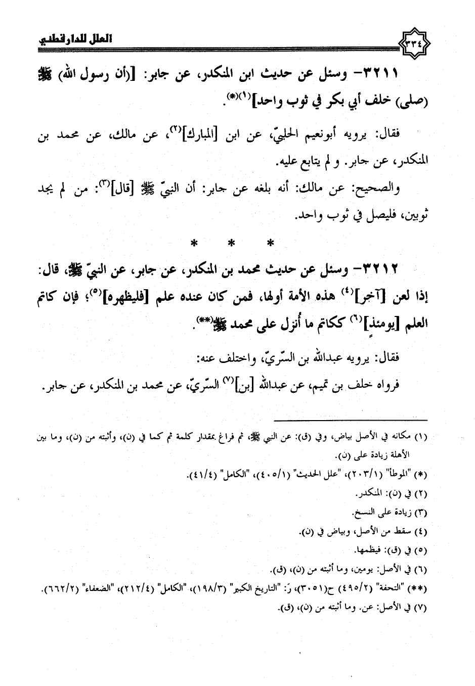 3212- وَسُئِلَ عَنْ حَدِيثِ مُحَمَّدِ بْنِ الْمُنْكَدِرِ، عَنْ جَابِرٍ، عَنِ النَّبِيِّ صَلَّى اللَّهُ عَلَيْهِ وَسَلَّمَ، قال: إذا لعن آخر هذه الأمة أولها، فمن كان عنده علم فليظهره، فإن كاتم العلم يومئذ ككاتم ما أُنْزِلَ عَلَى مُحَمَّدٍ صَلَّى اللَّهُ عَلَيْهِ وَسَلَّمَ.