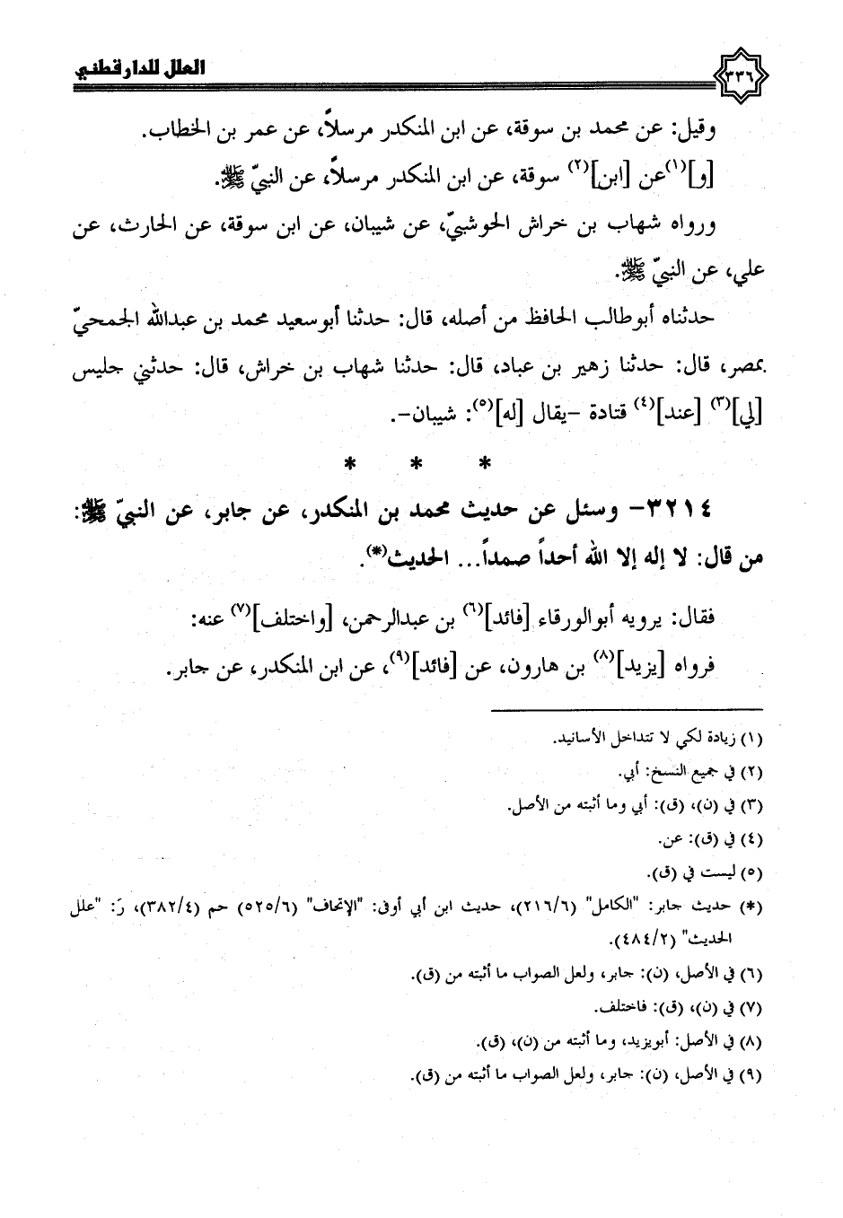 3214- وَسُئِلَ عَنْ حَدِيثِ مُحَمَّدِ بْنِ الْمُنْكَدِرِ، عَنْ جَابِرٍ، عَنِ النَّبِيِّ صَلَّى اللَّهُ عَلَيْهِ وَسَلَّمَ من قال: لا إله إلا الله أحدا صمدا ... الحديث.