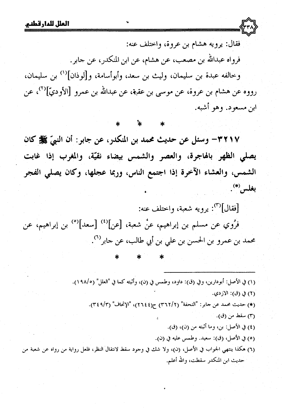 3217- وَسُئِلَ عَنْ حَدِيثِ مُحَمَّدِ بْنِ الْمُنْكَدِرِ، عَنْ جَابِرٍ؛ أَن النَّبِيَّ صَلَّى اللَّهُ عَلَيْهِ وَسَلَّمَ كان يصلي الظهر بالهاجرة، والعصر والشمس بيضاء نقية، والمغرب إذا غابت الشمس، والعشاء الآخرة إذا اجتمع الناس، وربما عجلها، وكان يصلي الفجر بغلس.