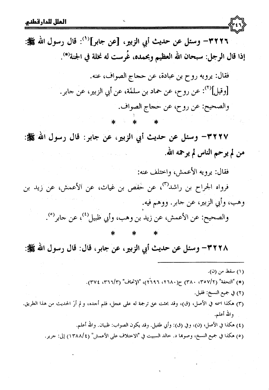 3226- وسئل عن حديث أبي الزبير، عن جابر: قال رسول الله صلى الله عليه وسلم: إذا قال الرجل: سبحان الله العظيم وبحمده، غرست له نخلة في الجنة.