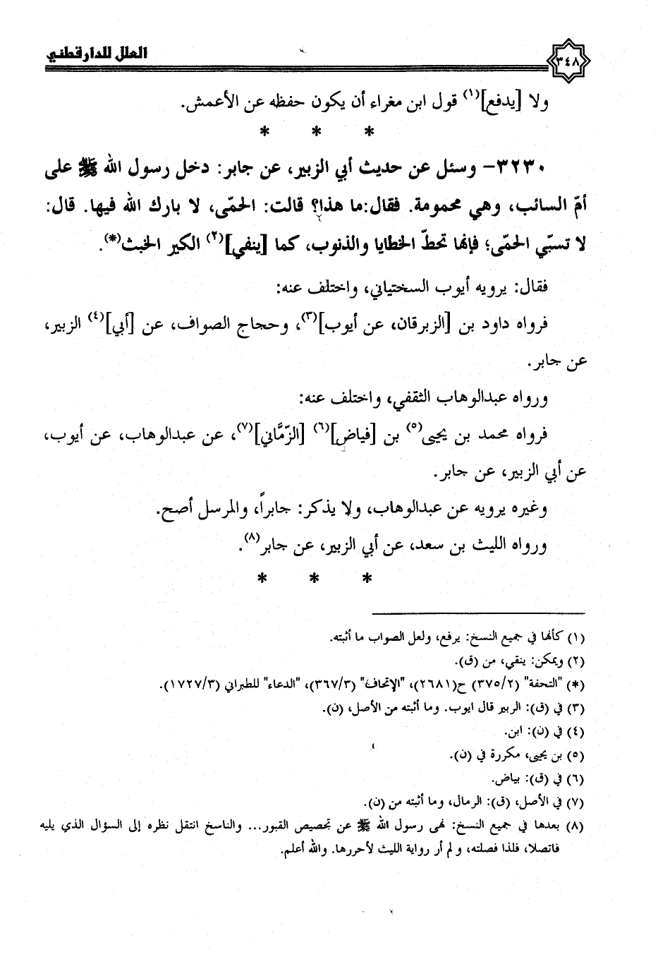 3230- وسئل عن حديث أبي الزبير، عن جابر: دَخَلَ رَسُولُ اللَّهِ صَلَّى اللَّهُ عَلَيْهِ وَسَلَّمَ على أم السائب، وهي محمومة، فقال: ما هذا؟ قالت: الحمى، لا بارك الله فيها، قال: لا تسبي الحمي، فإنها تحط الخطايا والذنوب، كما ينفي الكير الخبث.
