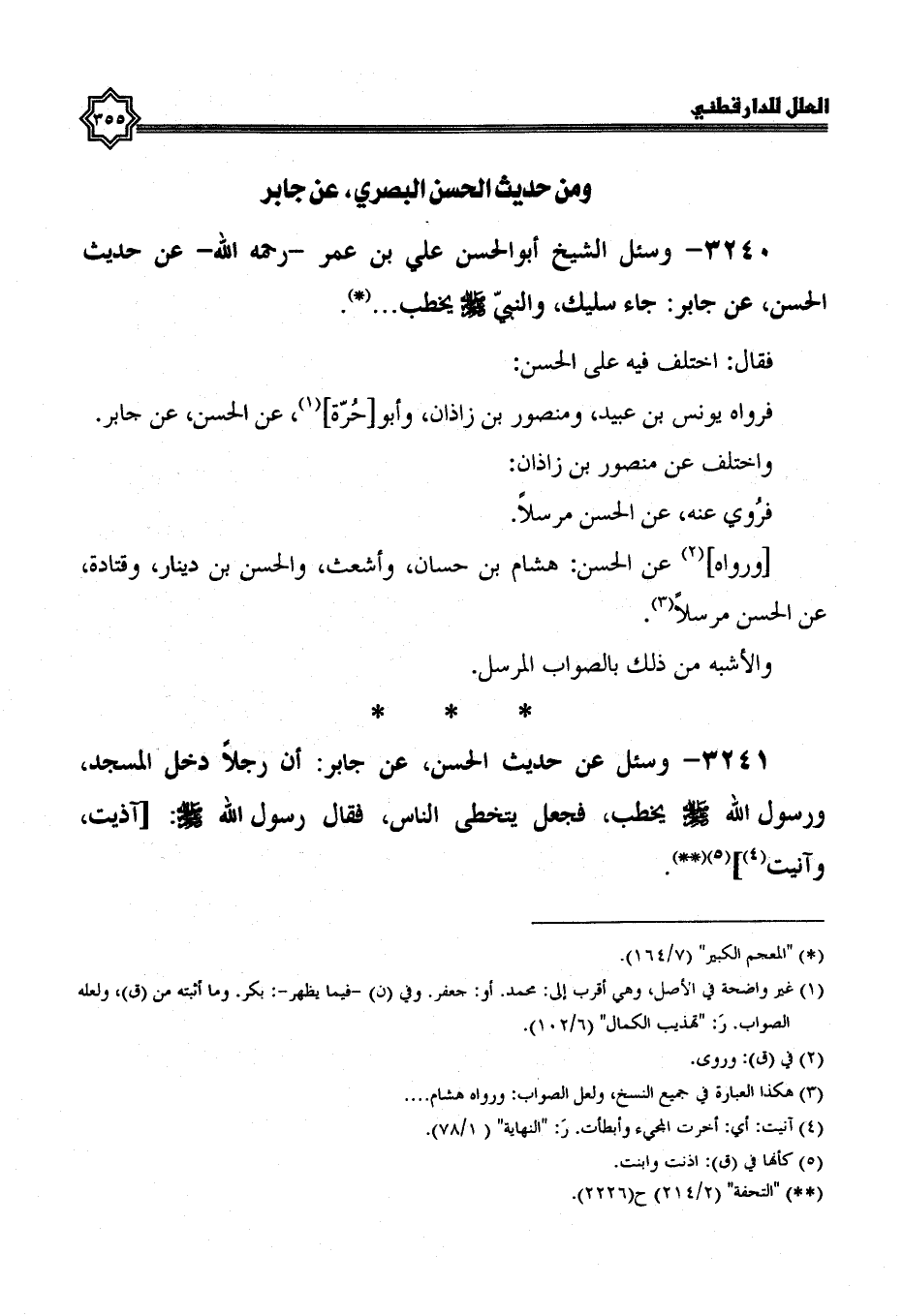 3240- وَسُئِلَ الشَّيْخُ أَبُو الْحَسَنِ عَلِيُّ بْنُ عُمَرَ، رحمه الله، عن حديث الحسن، عن جابر: جاء سليك، والنبي صلى الله عليه وسلم يخطب.