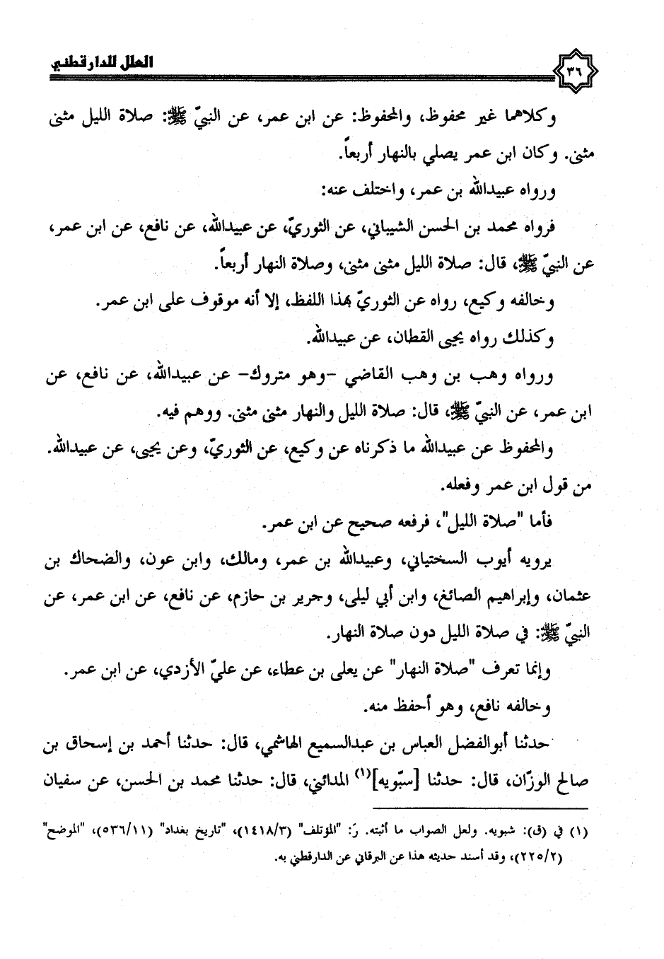 والمحفوظ: عَنِ ابْنِ عُمَرَ، عَنِ النَّبِيِّ صَلَّى اللَّهُ عليه وسلم: صلاة الليل مثنى مثنى، وكان ابن عمر يصلي بالنهار أربعا.