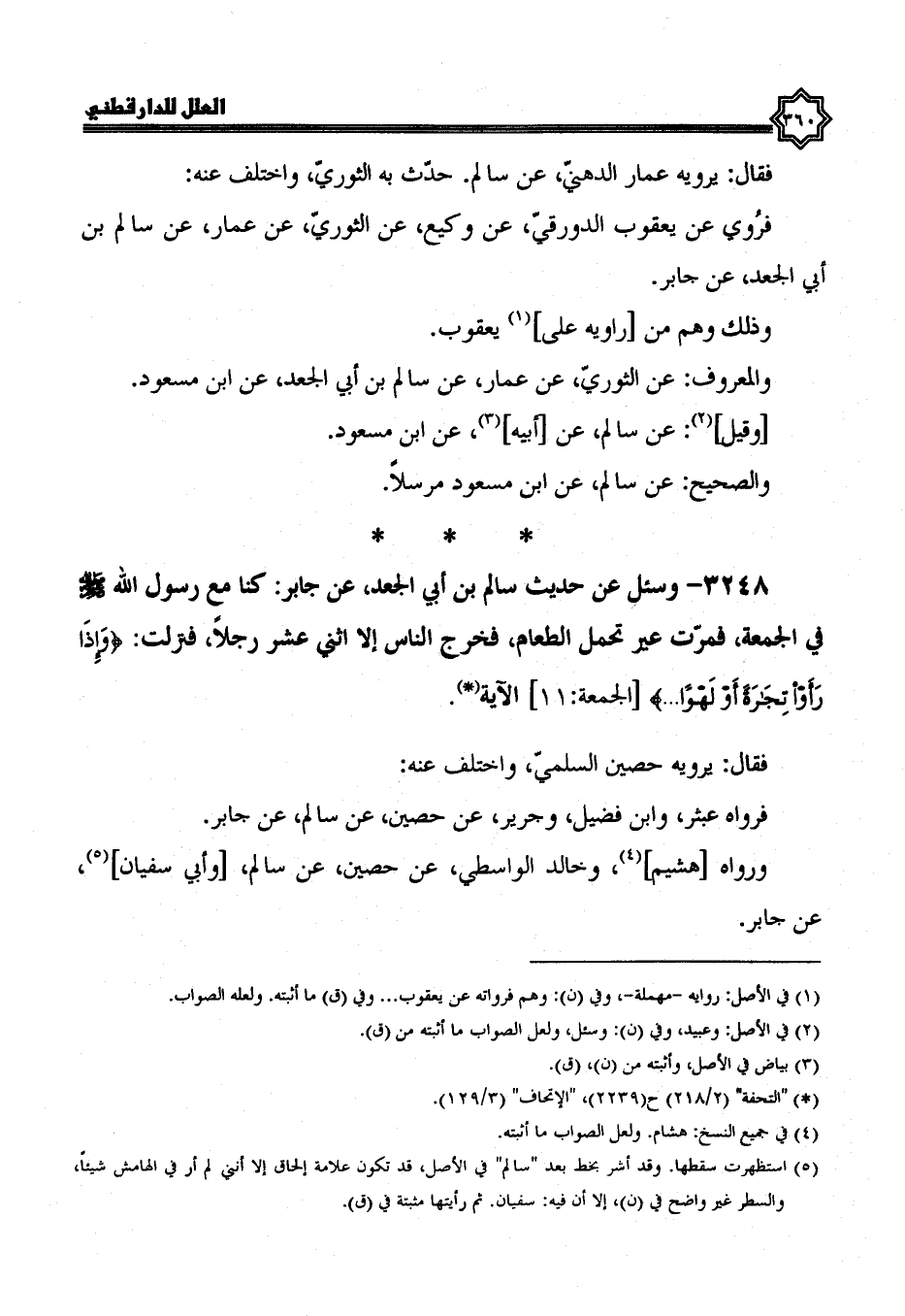 3248- وَسُئِلَ عَنْ حَدِيثِ سَالِمِ بْنِ أَبِي الْجَعْدِ، عن جابر؛ كُنَّا مَعَ رَسُولِ اللَّهِ صَلَّى اللَّهُ عَلَيْهِ وسلم في الجمعة، فمرت عير تحمل الطعام، فخرج الناس إلا اثني عشر رجلا، فنزلت: {وإذا رأوا تجارة أو لهوا} الآية.