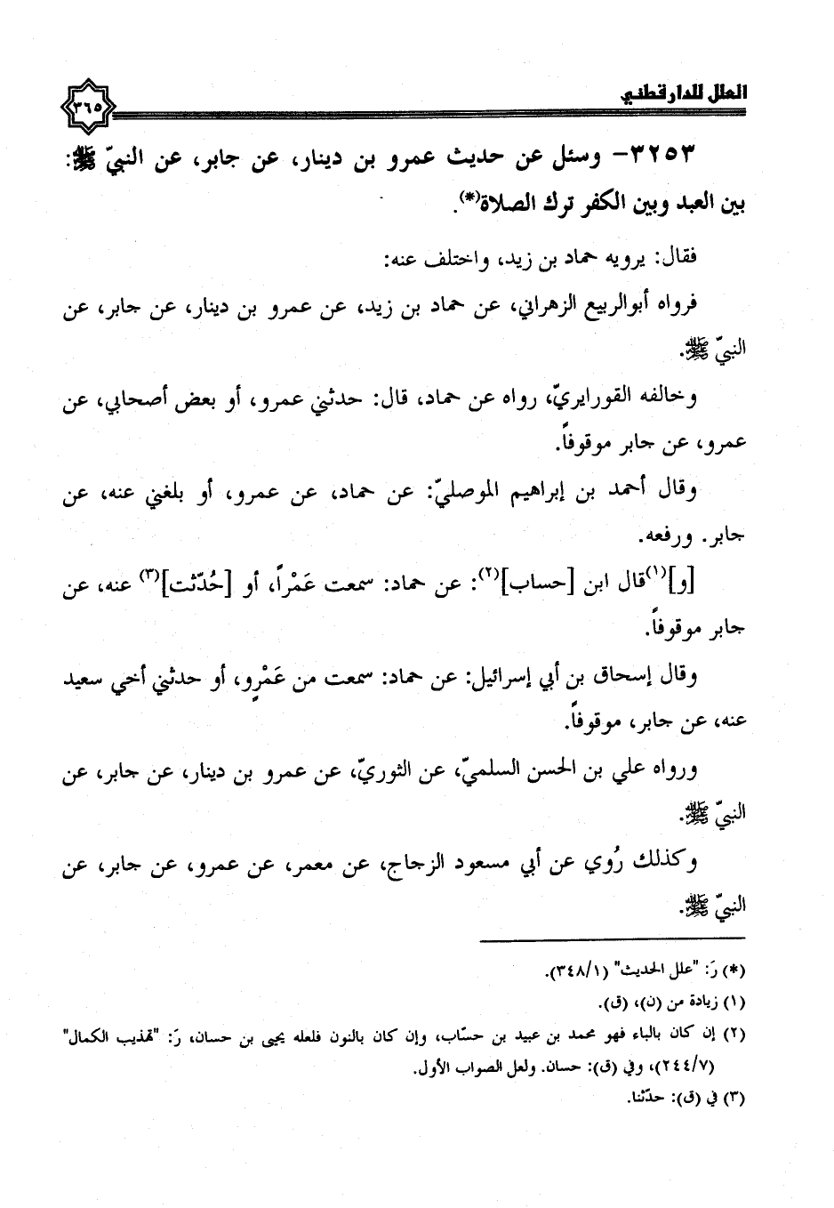 3253- وسئل عن حديث عَمْرِو بْنِ دِينَارٍ، عَنْ جَابِرٍ، عَنِ النَّبِيِّ صلى الله عليه وسلم: بين العبد وبين الكفر ترك الصلاة.