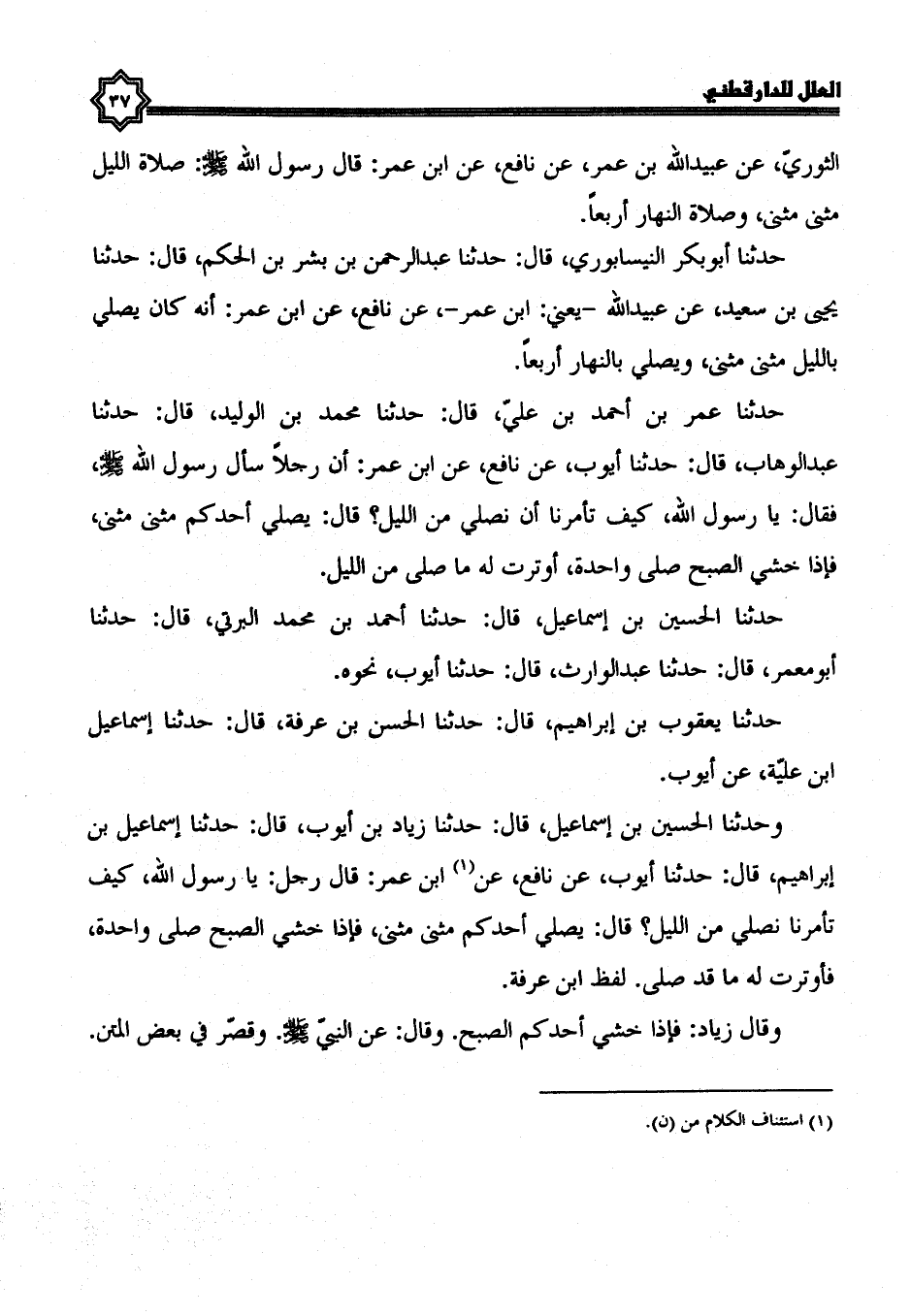 يرويه أيوب السختياني، وعبيد الله بن عمر، ومالك، وابن عون، والضحاك بن عثمان، وإبراهيم الصائغ، وابن أبي ليلى، وجرير بن حازم، عَنْ نَافِعٍ، عَنِ ابْنِ عُمَرَ، عَنِ النَّبِيِّ صلى الله عليه وسلم؛ في صلاة الليل دون صلاة النهار.
