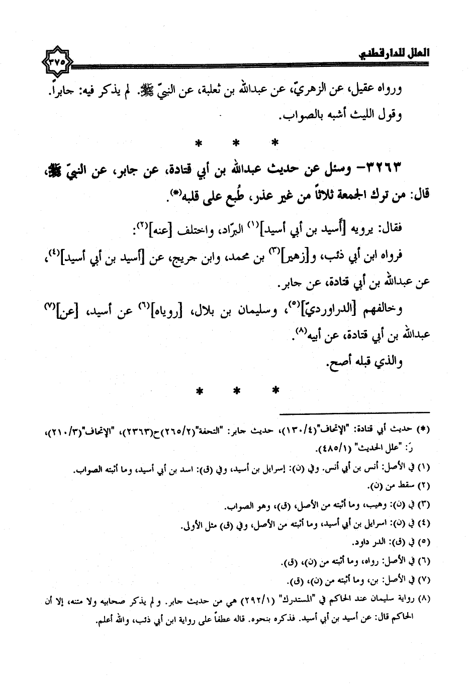 3263- وَسُئِلَ عَنْ حَدِيثِ عَبْدِ اللَّهِ بْنِ أَبِي قتادة، عَنْ جَابِرٍ، عَنِ النَّبِيِّ صَلَّى اللَّهُ عَلَيْهِ وسلم، قال: من ترك الجمعة ثلاثا من غير عذر طبع على قلبه.