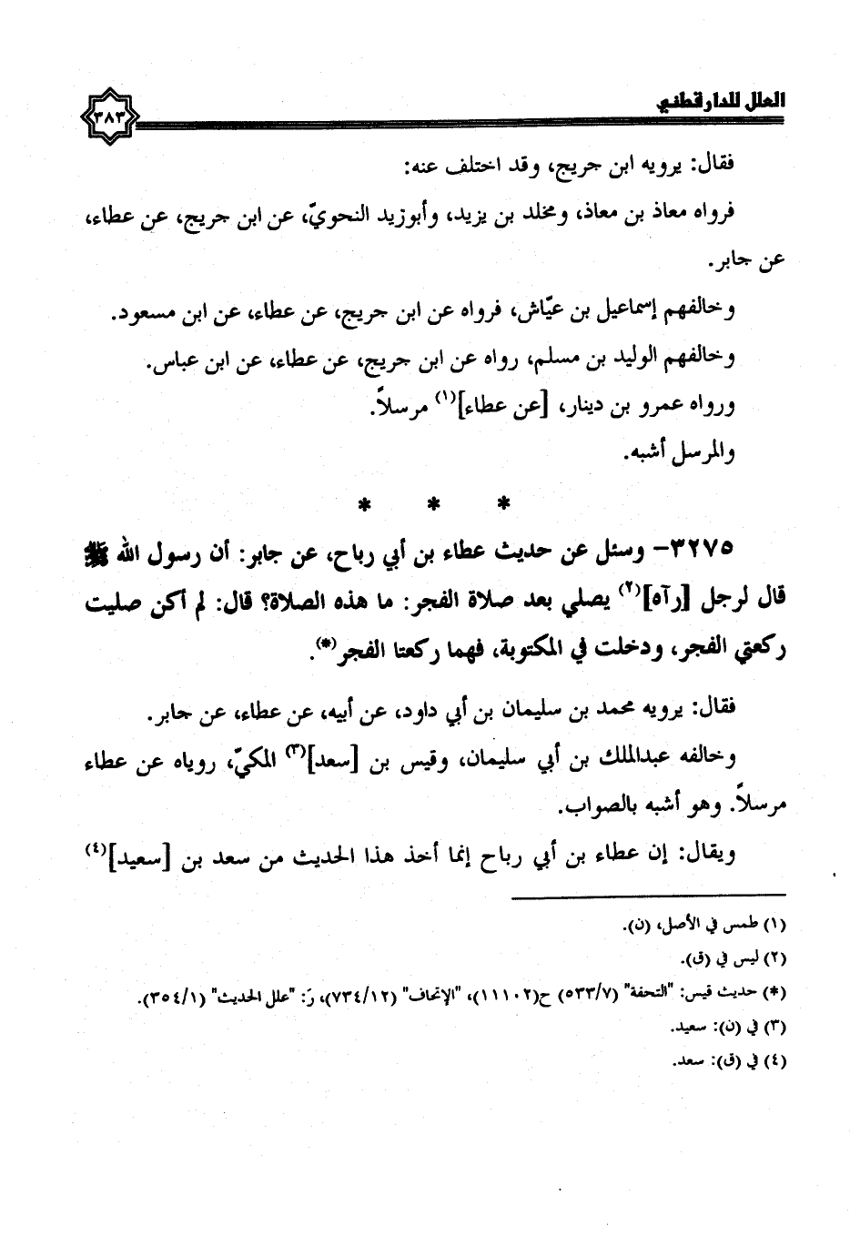 3275- وَسُئِلَ عَنْ حَدِيثِ عَطَاءِ بْنِ أَبِي رَبَاحٍ، عن جابر، أن رسول الله صلى الله عليه وسلم، قال لرجل، رآه يصلي بعد صلاة الفجر: ما هذه الصلاة؟ قال: لم أكن صليت ركعتي الفجر، ودخلت في المكتوبة فهما ركعتا الفجر.