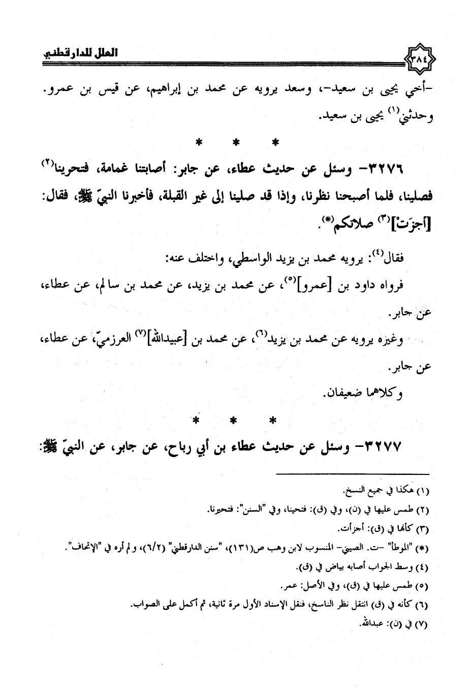 3276- وسئل عن حديث عطاء، عن جابر، أصابتنا غمامة، فتحرينا، فصلينا، فلما أصبحنا نظرنا، وإذا قد صلينا إلى غير القبلة، فأخبرنا النبي صلى الله عليه وسلم، فقال: أجزت صلاتكم.