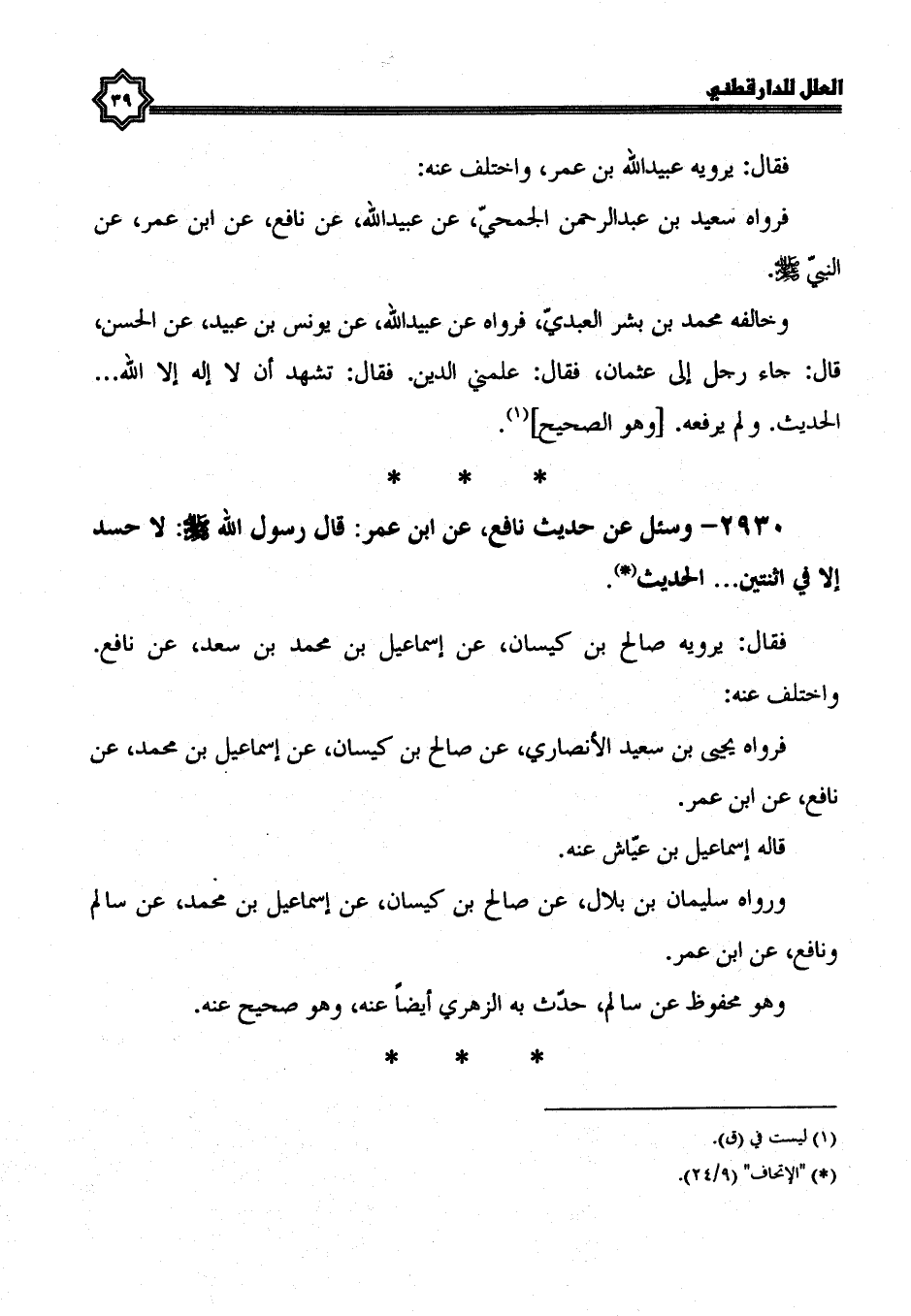 2930- وَسُئِلَ عَنْ حَدِيثِ نَافِعٍ، عَنِ ابْنِ عُمَرَ: قَالَ رَسُولُ اللَّهِ صَلَّى اللَّهُ عَلَيْهِ وَسَلَّمَ: لَا حَسَدَ إِلَّا فِي اثنتين ... الْحَدِيثَ.
