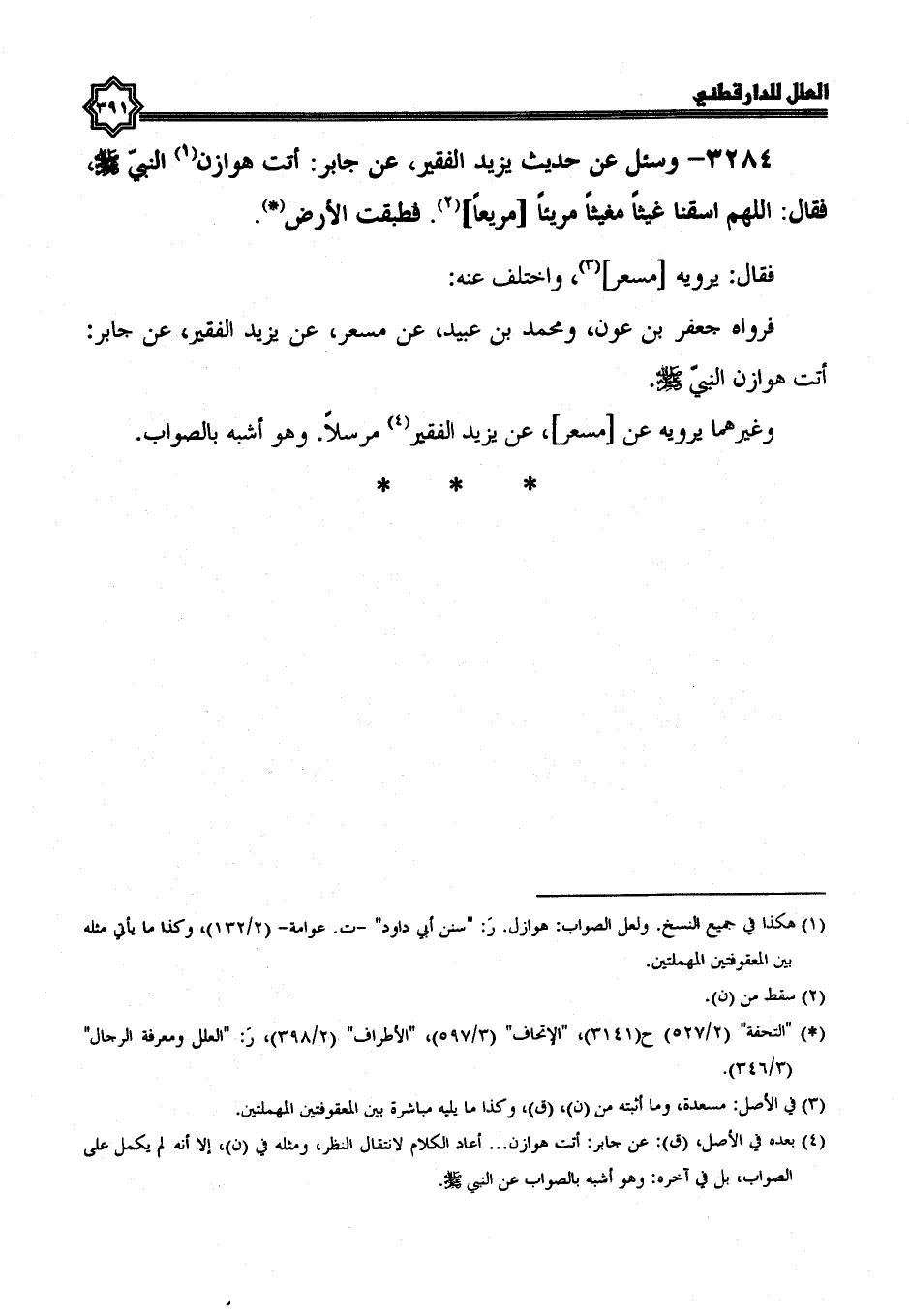 3284- وسئل عن حديث يزيد الفقير، عن جابر، أتت هوازن النبي صلى الله عليه وسلم، فقال: اللهم اسقنا غيثا مغيثا مريئا مريعا، فطبقت الأرض.