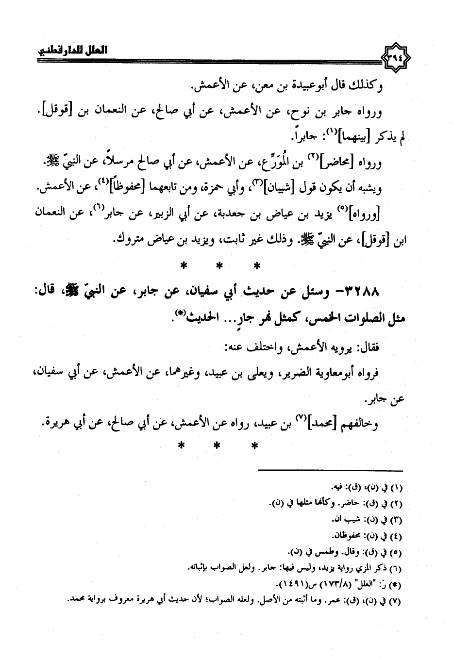 3288- وسئل عن حديث أبي سفيان، عَنْ جَابِرٍ، عَنِ النَّبِيِّ صَلَّى اللَّهُ عَلَيْهِ وسلم، قال: مثل الصلوات الخمس كمثل نهر جار ... الْحَدِيثَ.
