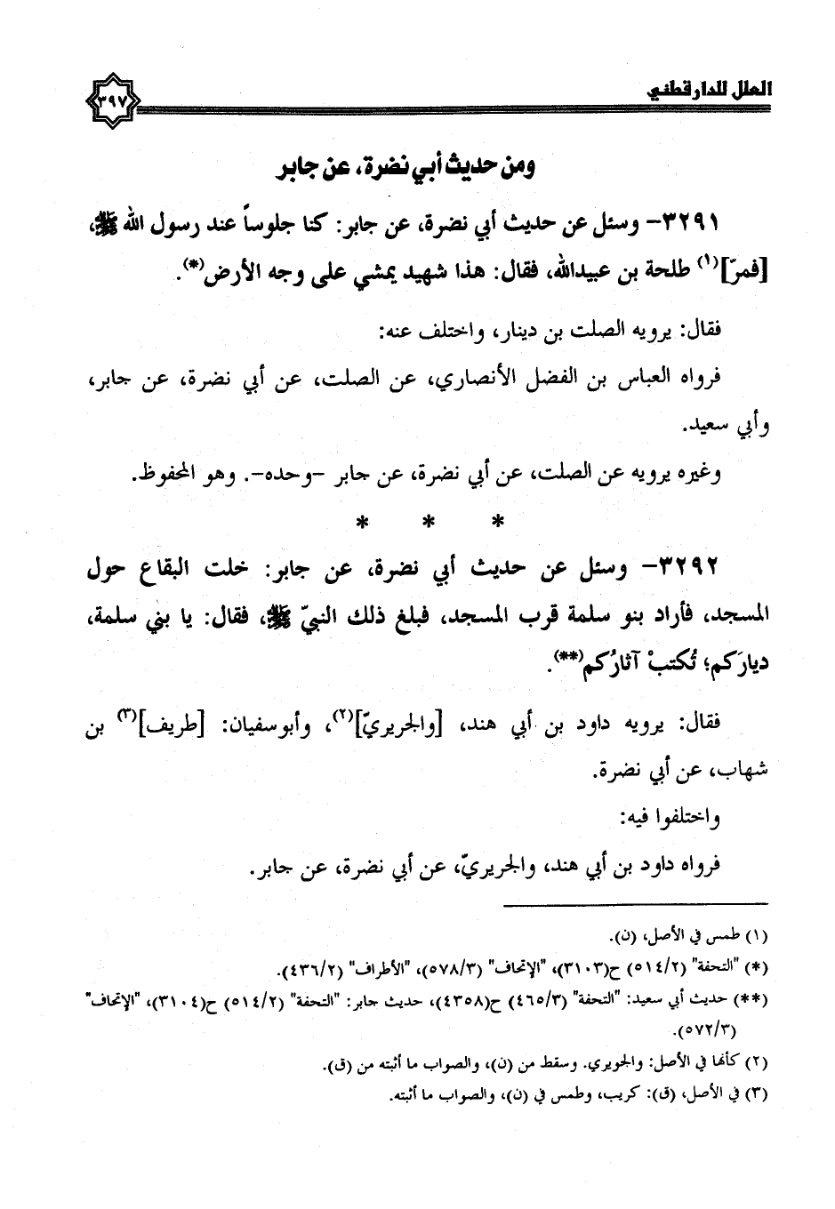 3291- وسئل عن حديث أبي نضرة، عن جابر، كنا جلوسا عِنْدَ رَسُولِ اللَّهِ صَلَّى اللَّهُ عَلَيْهِ وَسَلَّمَ فمر طلحة بن عبيد الله، فقال: هذا شهيد يمشي على وجه الأرض.
