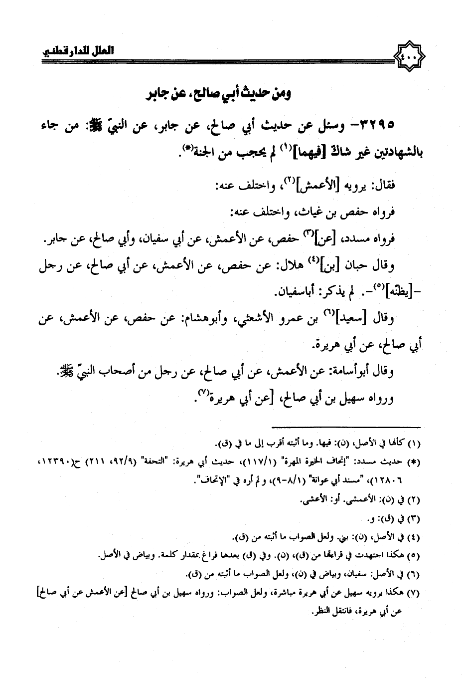 فرواه مسدد، عن حفص، عن الأعمش، عن أبي سفيان، وأبي صالح، عن جابر وقال: حبان بن هلال، عَنْ حَفْصٍ، عَنِ الْأَعْمَشِ، عَنْ أَبِي صَالِحٍ، عن رجل، يظنه، لم يذكر أبا سفيان، وقال سعيد بن عمرو الأشعثي، وأبو هشام، عَنْ حَفْصٍ، عَنِ الْأَعْمَشِ، عَنْ أَبِي صَالِحٍ، عَنْ أَبِي هريرة، وقال أبو أسامة: عَنِ الْأَعْمَشِ، عَنْ أَبِي صَالِحٍ، عَنْ رَجُلٍ مِنْ أَصْحَابِ النَّبِيِّ صَلَّى اللَّهُ عليه وسلم.