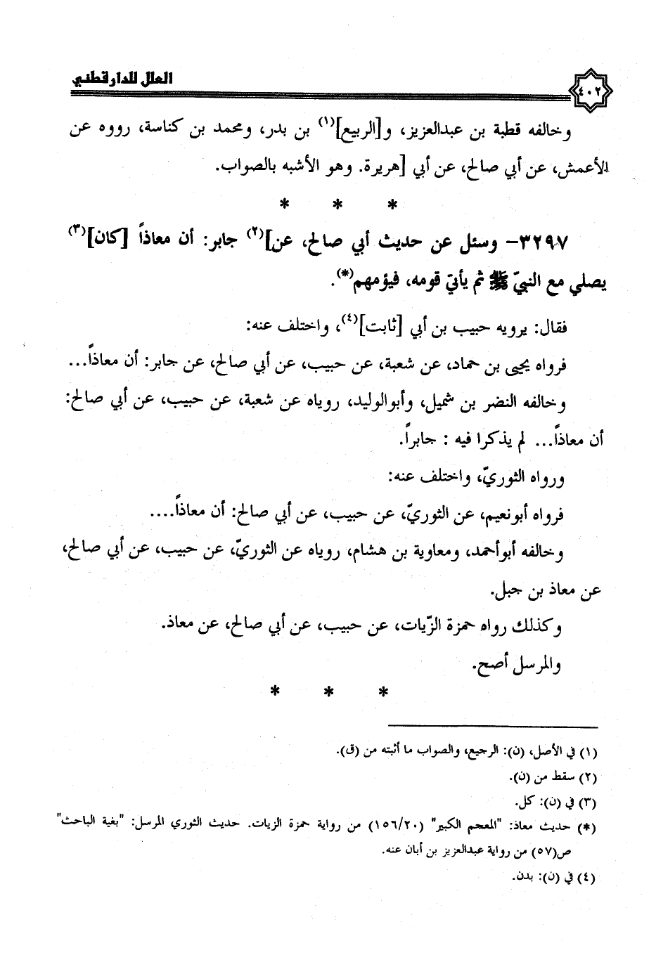 3297- وسئل عن حديث أبي صالح، عن جابر، أن معاذا كان يصلي مع النبي صلى الله عليه وسلم، ثم يأتي قومه فيؤمهم.