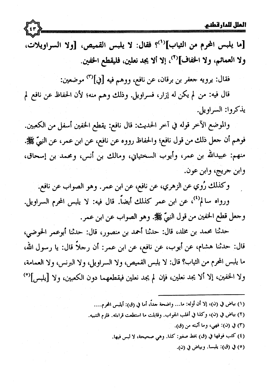 ورواه سالم، عن ابن عمر كذلك أيضا، قال فيه: لا يلبس المحرم السراويل، وجعل قطع الخفين مِنْ قَوْلِ النَّبِيِّ صَلَّى اللَّهُ عَلَيْهِ وَسَلَّمَ وَهُوَ الصَّوَابُ، عن ابن عمر.