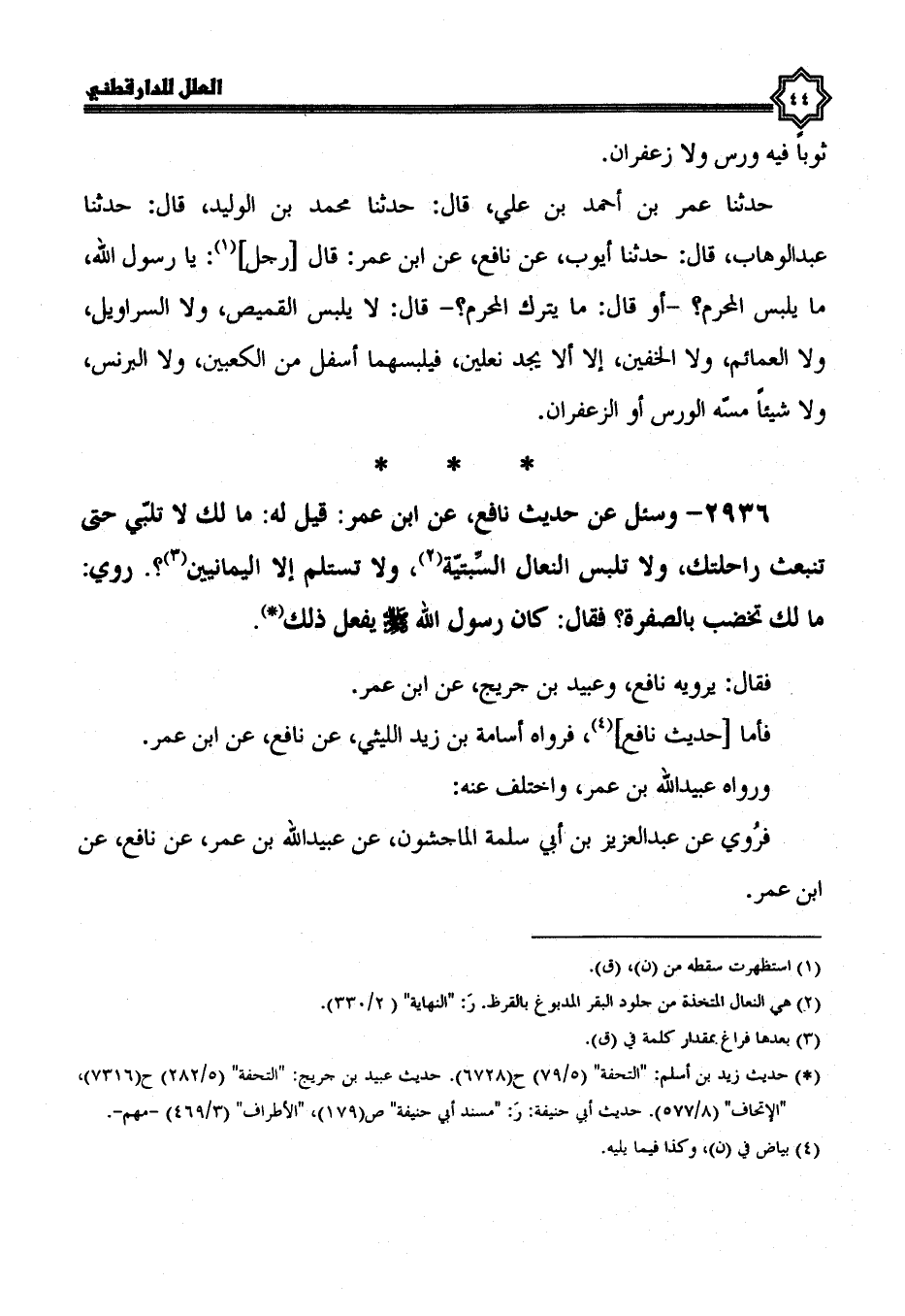 2936- وَسُئِلَ عَنْ حَدِيثِ نَافِعٍ، عَنِ ابْنِ عُمَرَ: قيل له: مالك لا تلبي حتى تنبعث راحلتك، ولا تلبس النعال السبتية، ولا تستلم إلا اليمانيين؟ روي ما لك تخضب بالصفرة؟ فَقَالَ: كَانَ رَسُولُ اللَّهِ صَلَّى اللَّهُ عَلَيْهِ وسلم يفعل ذلك.