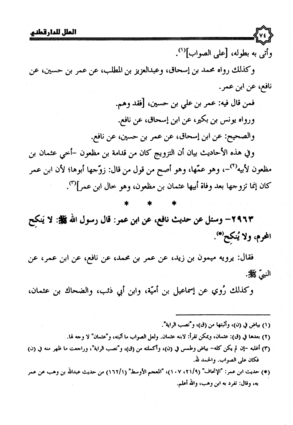 2963- وَسُئِلَ عَنْ حَدِيثِ نَافِعٍ، عَنِ ابْنِ عُمَرَ: قَالَ رَسُولُ اللَّهِ صَلَّى الله عليه وسلم: لا ينكح المحرم، ولا ينكح.