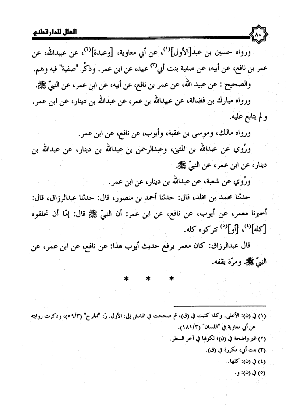ورواه حسين بن عبد الأول، عن أبي معاوية، وعبدة، عن عبيد الله، عن عمر بن نافع، عن أبيه، عن صفية بنت أبي عبيد، عن ابن عمر، وذكر صفية فيه وهم.