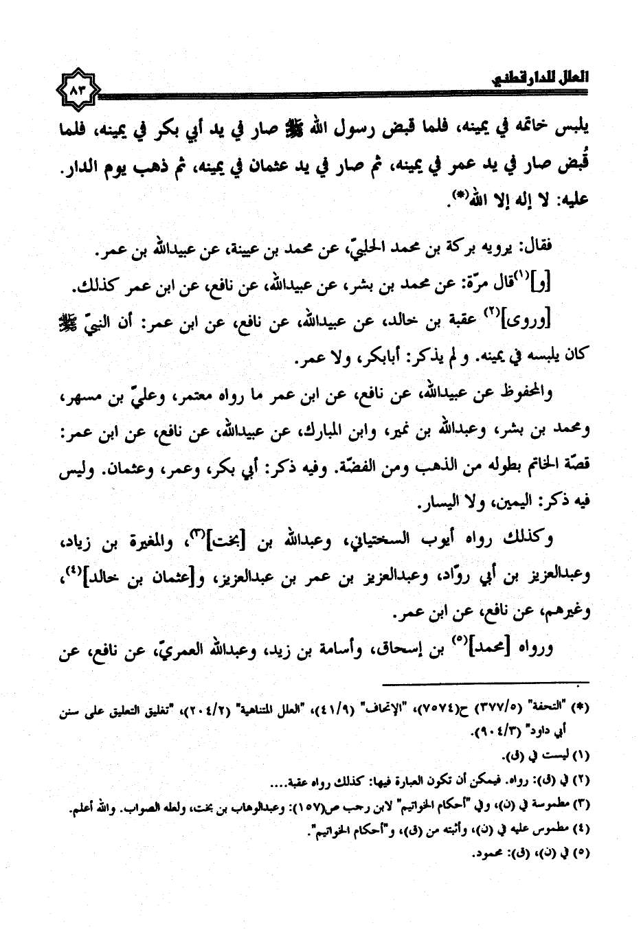 2971- وَسُئِلَ عَنْ حَدِيثِ نَافِعٍ، عَنِ ابْنِ عُمَرَ؛ أَنَّ النَّبِيَّ صَلَّى اللَّهُ عليه وسلم كان يلبس خاتمه في يمينه، فلما قبض رسول الله صلى الله عليه وسلم صار في يد أبي بكر في يمينه، فلما قبض صار في يد عمر في يمينه، ثم صار في يد عثمان في يمينه، ثم ذهب يوم الدار.
